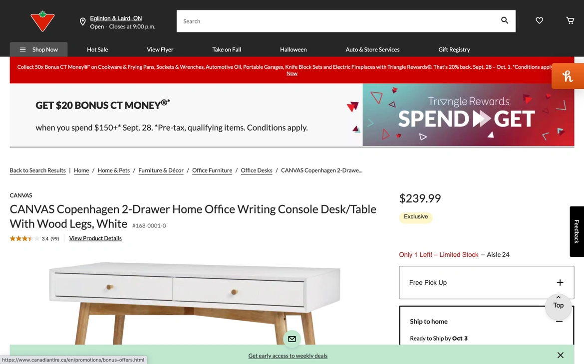 CANVAS Copenhagen 2-Drawer Writing Console Desk With Wood Legs