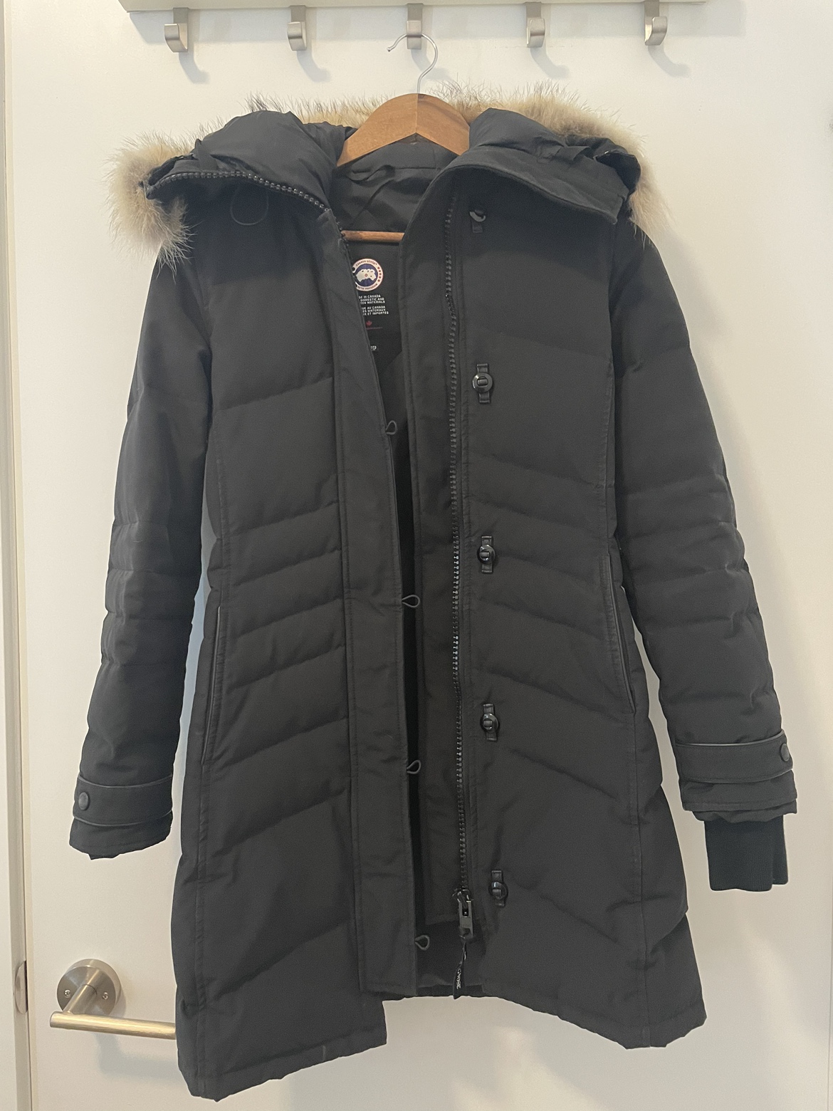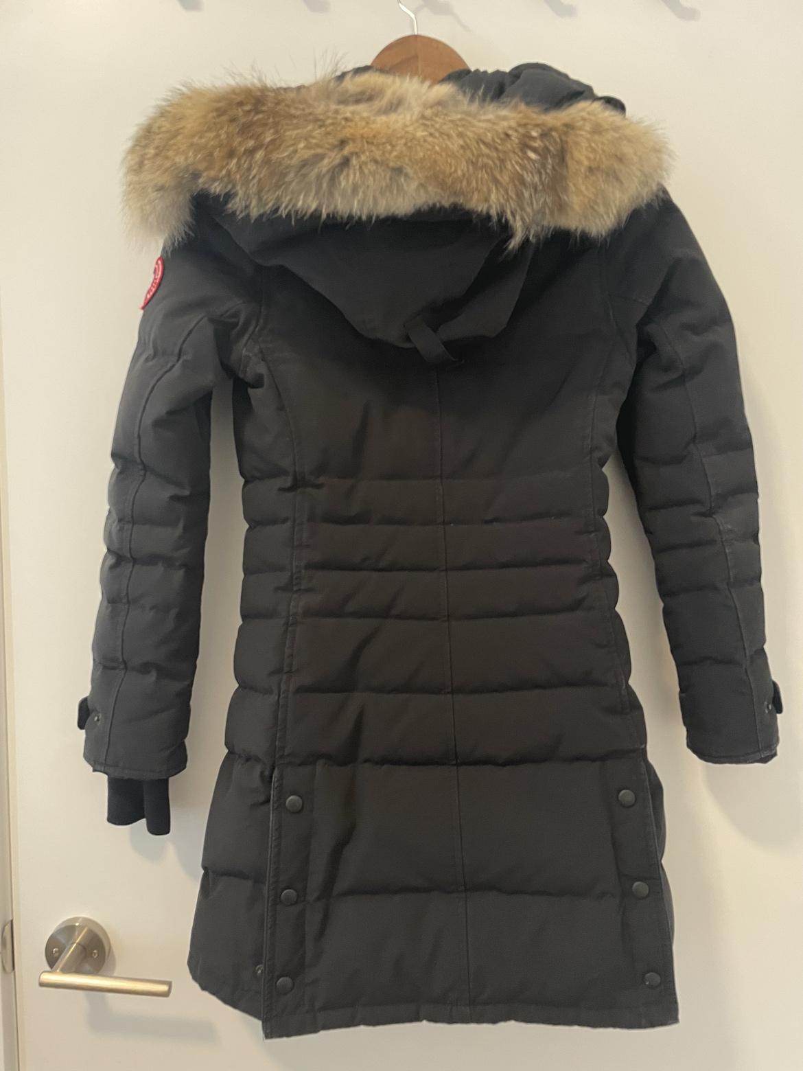 419Outgrew the parka, it’s an older version of the Loretta parka that they currently sell Size: 2XS Color: black Interior shoulder strap Two exterior fleece-lined pockets Pockets on both sides inside the jacket Removable fur Adjustable hood