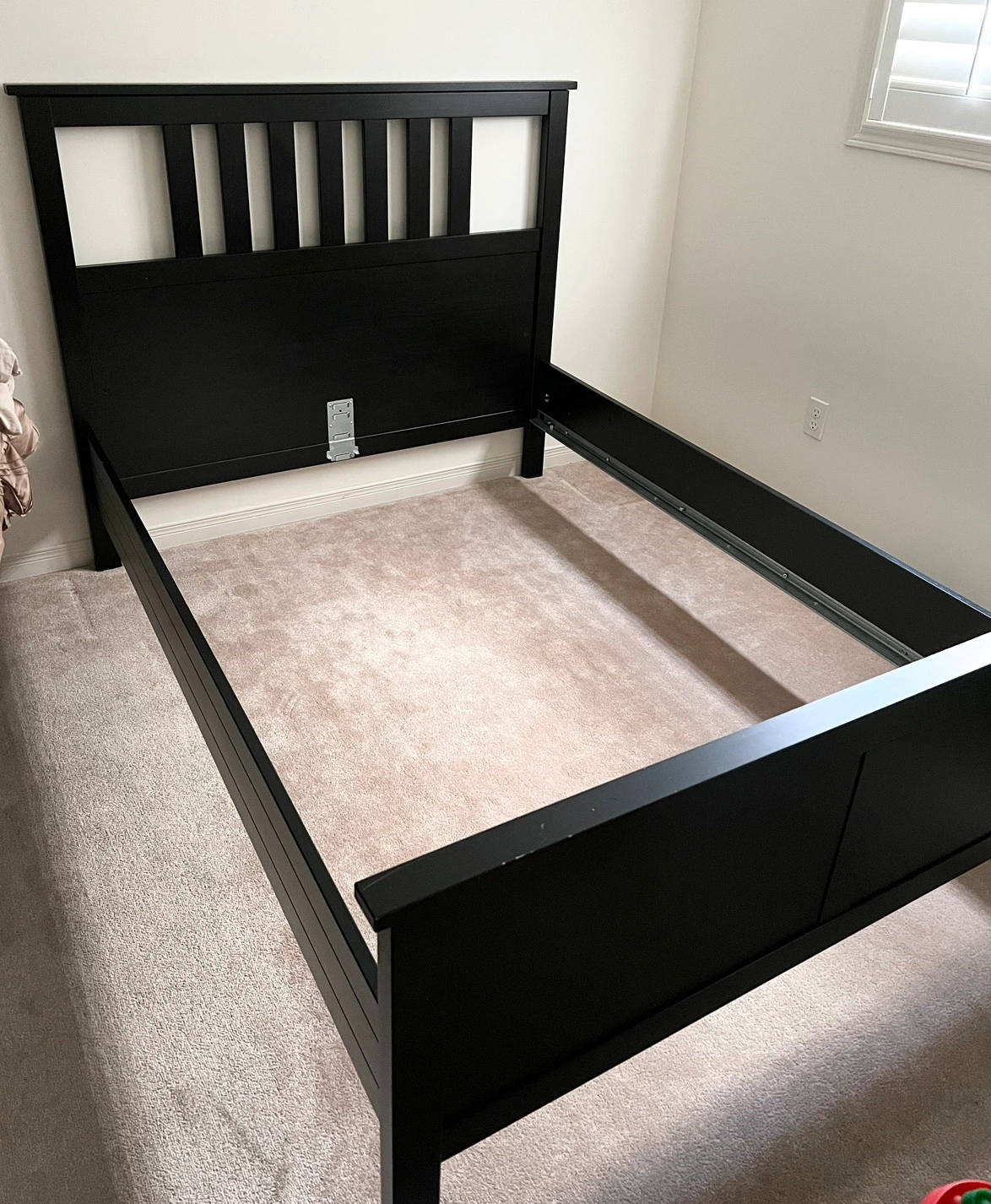 Ikea wooden full/double bed frame in good condition. Slates and beam are not pictured. Already dismantled. Upgraded to queen.