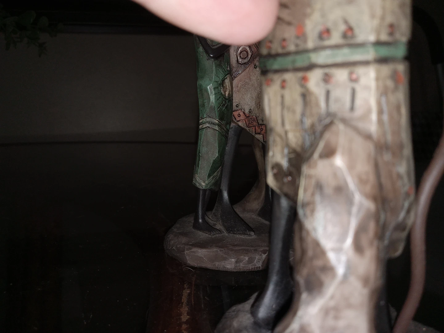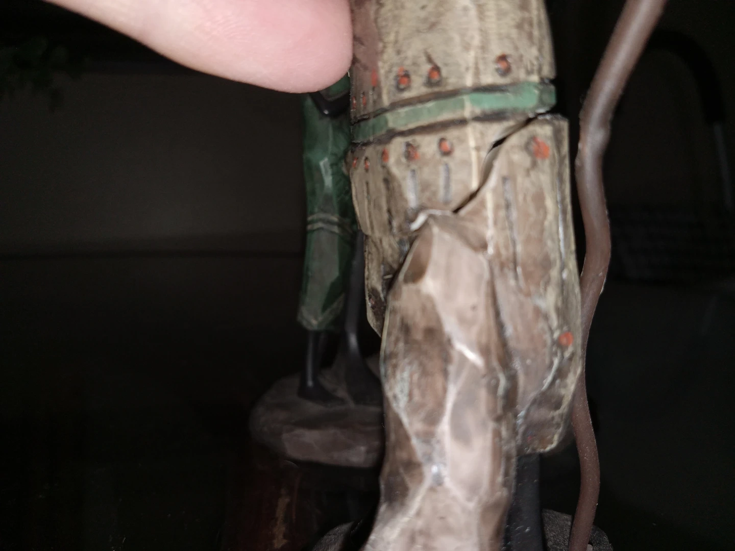 It is unfortunate that one has been cracked straight through and around as seen in the picture. In the last picture it is a clean break and fits back in snuggly. I would fix it, but I don't want to ruin her with my shaky hands. The inner pole inside is keeping her intact. Otherwise these are in great used condition.