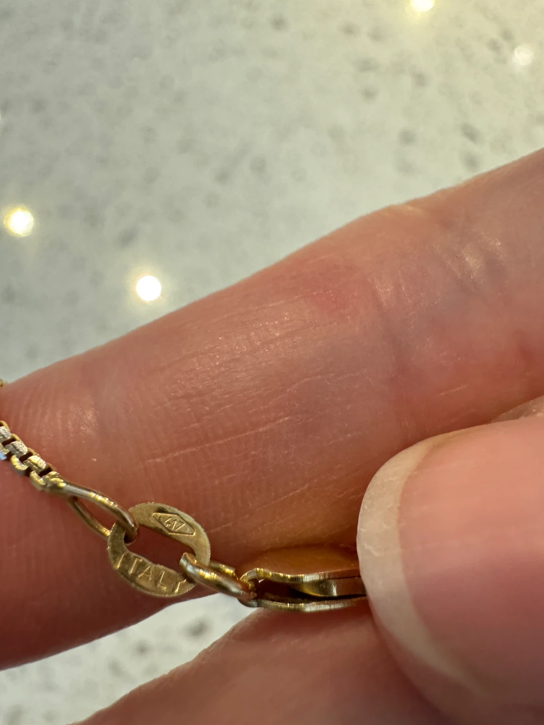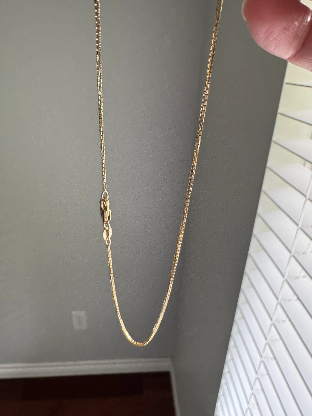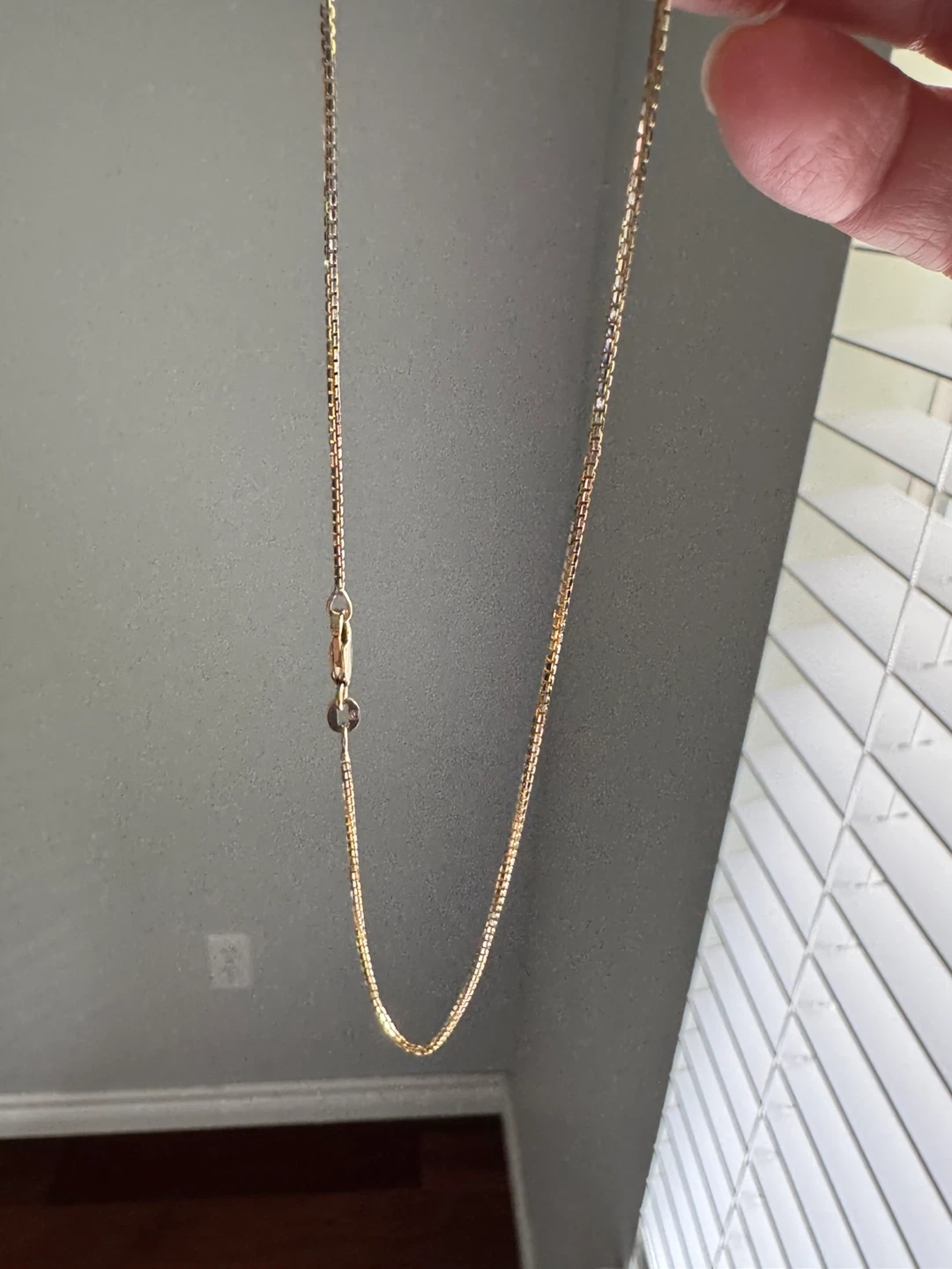Selling a delicate two-tone box chain necklace in white and yellow gold. Features a secure lobster claw clasp and a beautiful sparkle that shimmers from every angle.