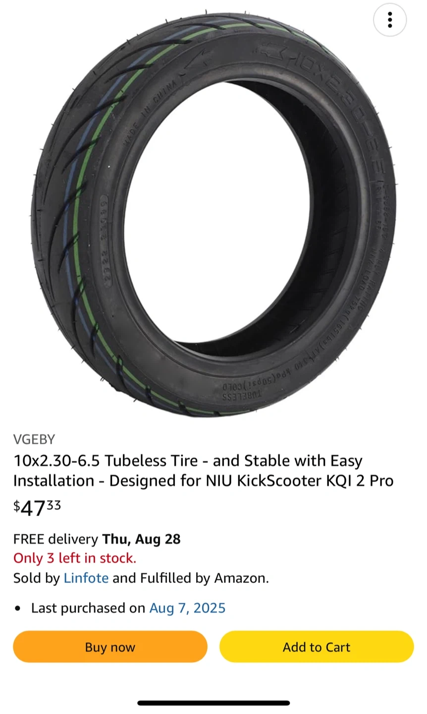 Selling a VGEBY 10x2.30-6.5 tubeless tire, designed for the NIU KickScooter KQI 2 Pro and many more It's stable and offers easy installation. Originally bought for $47.33