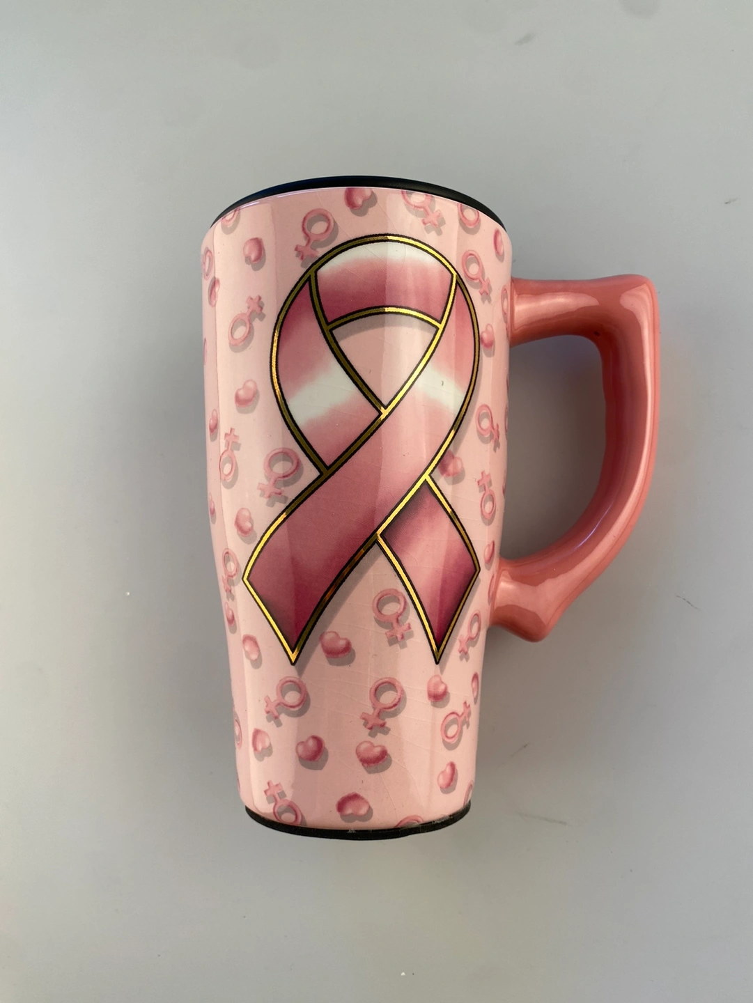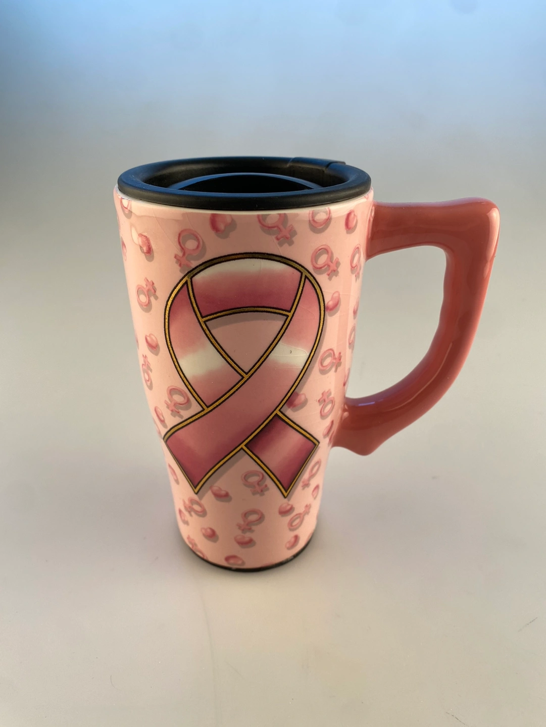 This tall pink Breast Cancer Awareness Ceramic Travel Mug has an all over woman symbol & puffy heart design with a large pink ribbon on both sides. Has a large pink handle and comes with a black plastic lid.