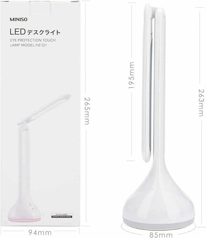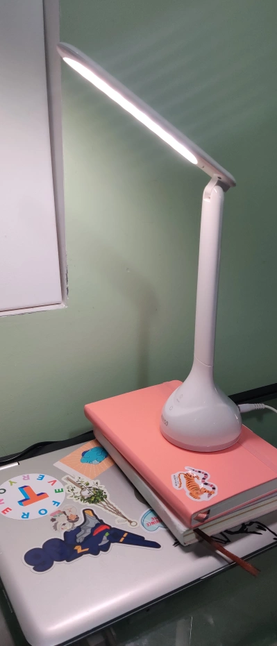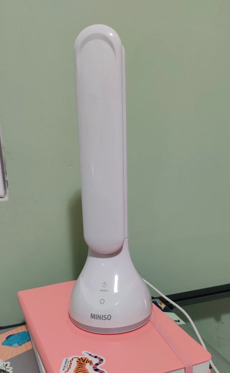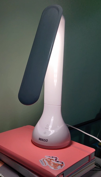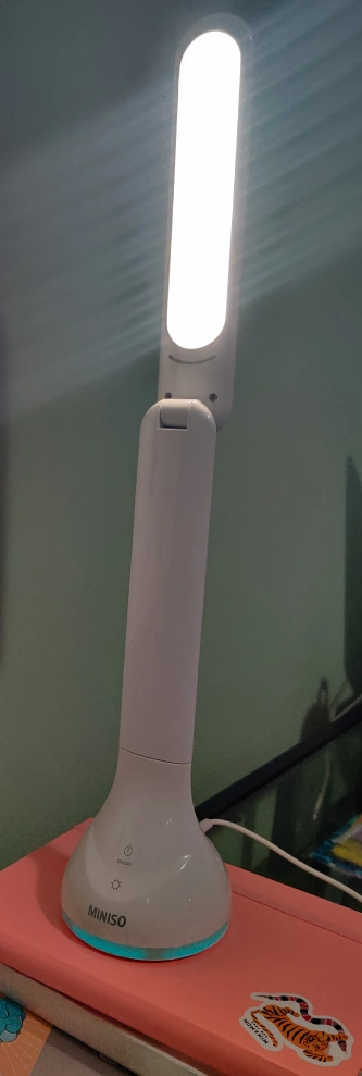 super cute, light and portable folding lamp from MINISO. 3 brightness settings and ambient light colour cycling on the base. comes with charging USB cable, but can be used wireless.