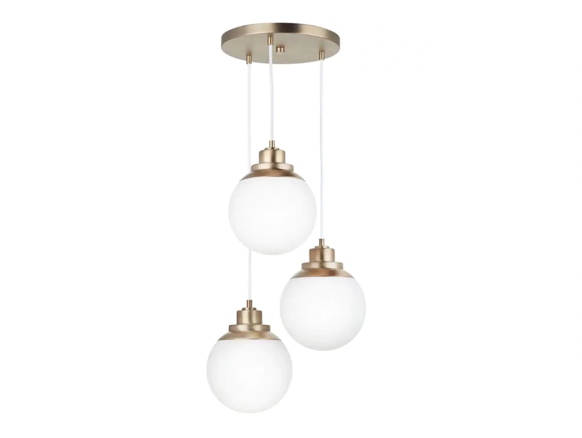 Features: 3 lights in a mid-century modern style, a brass finish with a matte white glass shade