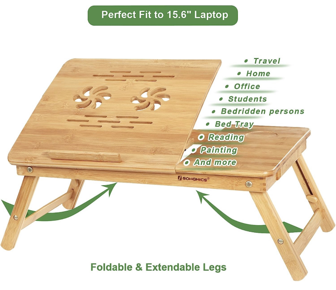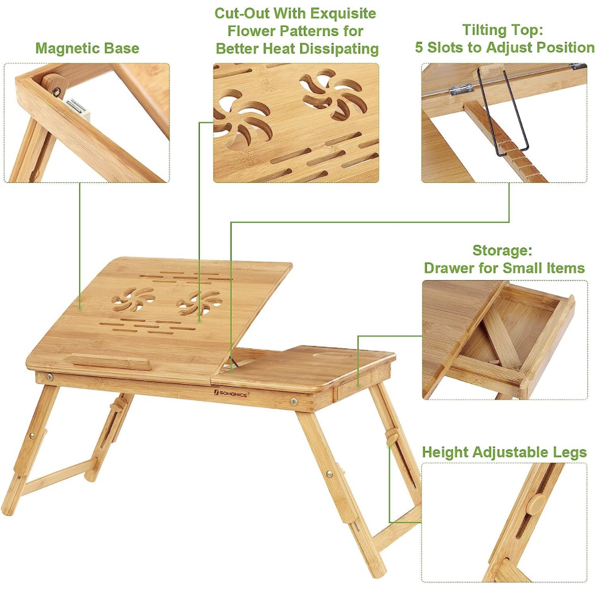 SONGMICS Bamboo Laptop Desk Serving Bed Tray Breakfast Table Tilting Top with Drawer