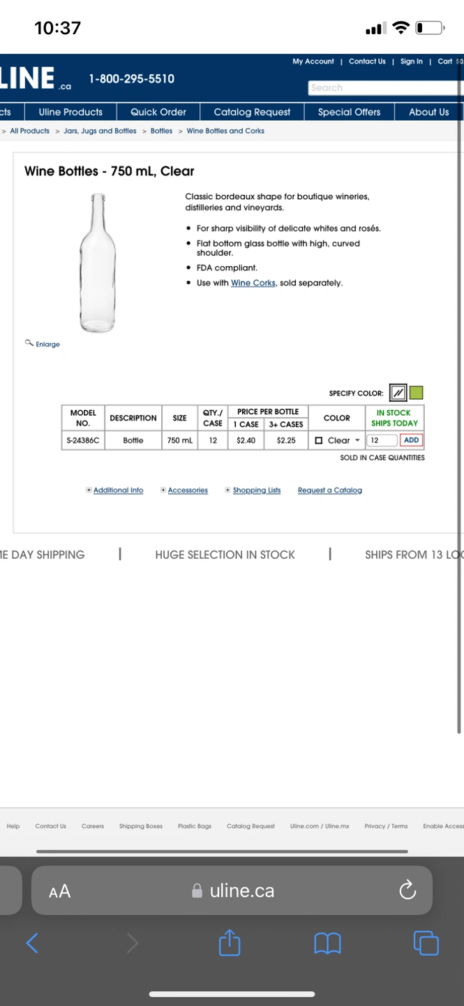 Clear wine bottles (corks not included) Case of 12. Brand new and never used (box is open) Retail price is $28.80 for one case (or 2.40 per bottle) Price is firm. Pick up only in Scarborough.