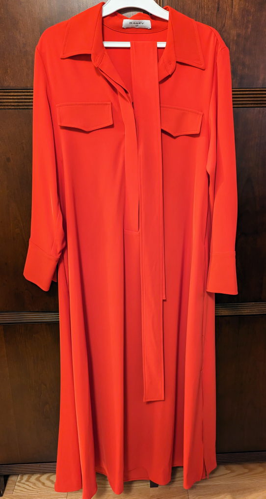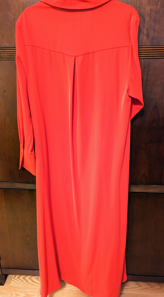 Never worn, long, red shirt style dress with deep side pockets. Can wear it with or without the belt. Wash and wear.