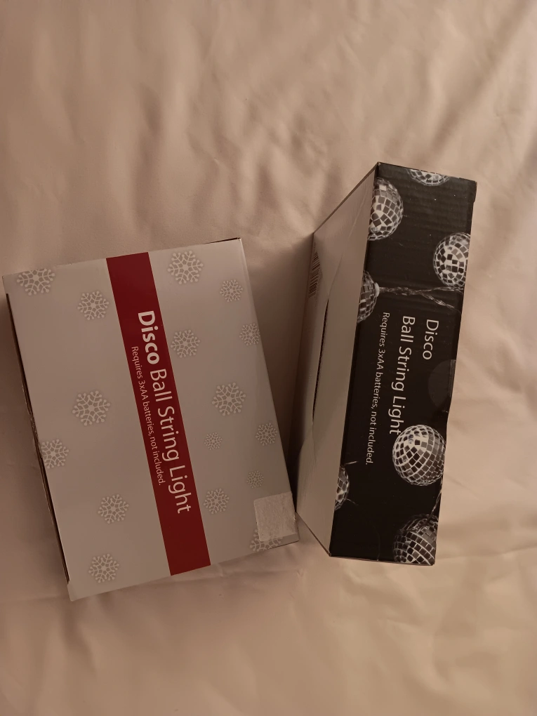 2 new boxes, battery operated - 3 AA batteries, 10 disco balls per string/per box , 2inch diameter balls that are lighted from the inside. Price is for both boxes.