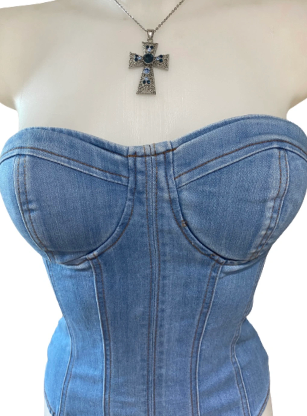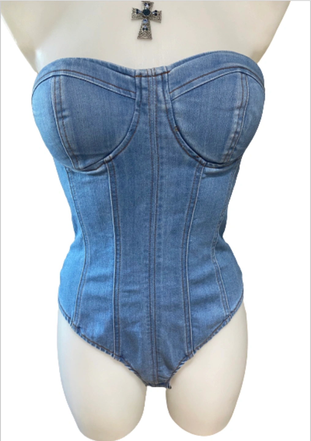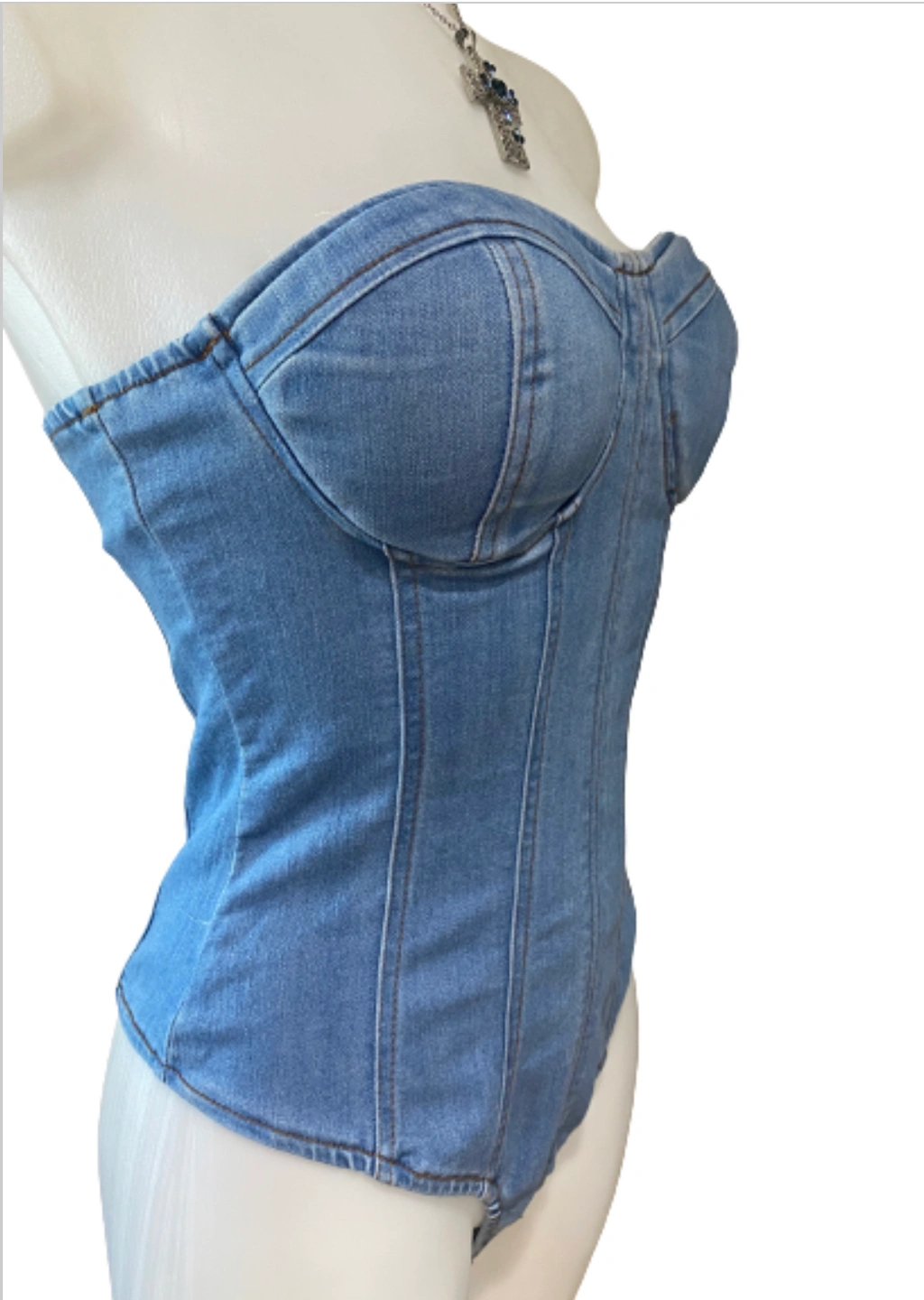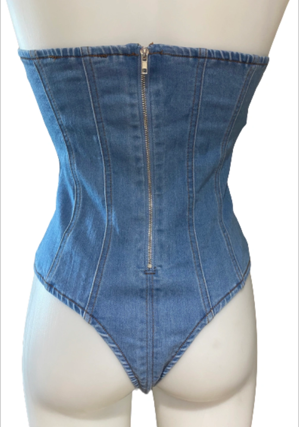A strapless woven bodysuit featuring a stretch light blue denim fabric, a sweetheart neckline, padded bra cups with underwire, princess seams, a back zipper closure and snap up crotch.