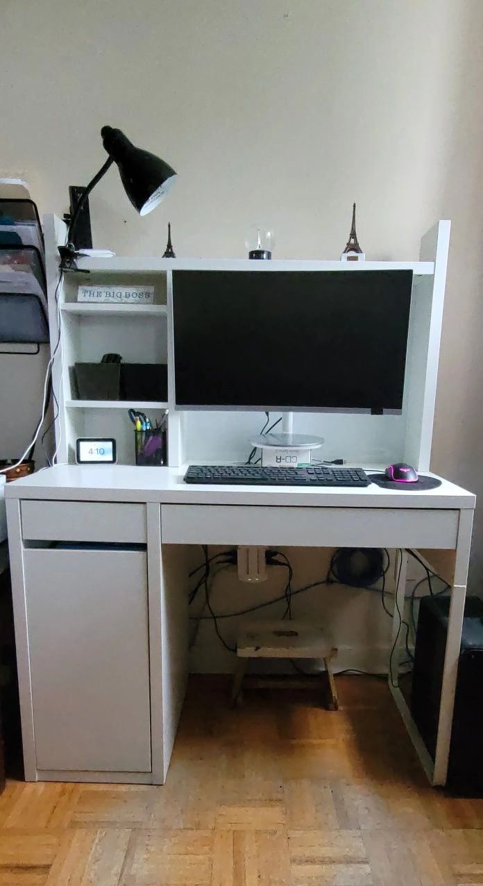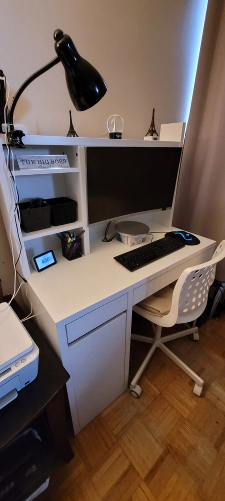 MICKE Used white desk. It has some scratches on it, but it's still in a good condition. The chair has a problem with the wheels as they don't move much, but also in good condition. Asking $60 for both.