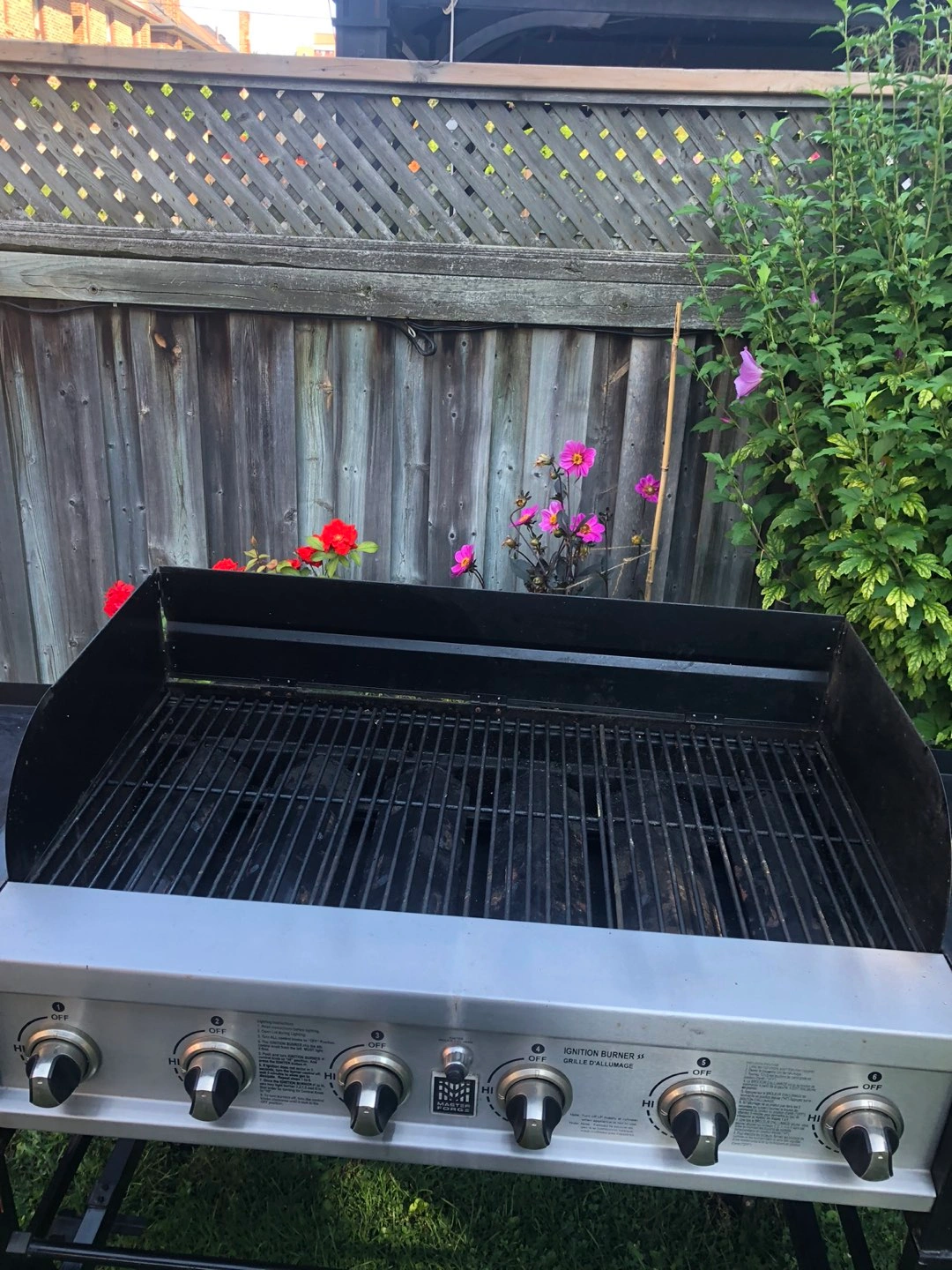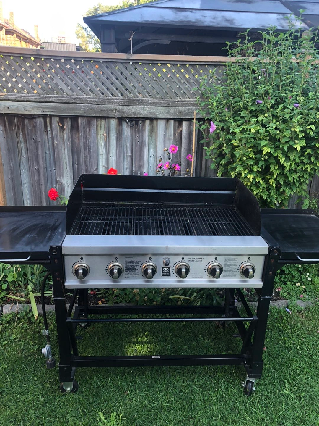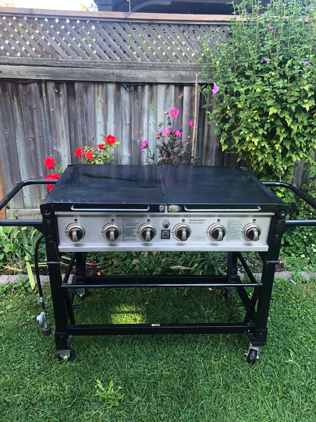 Large BBQ with 6 burners. Used only a couple times. Includes wind jammer/blocker. Storage trays on both sides.