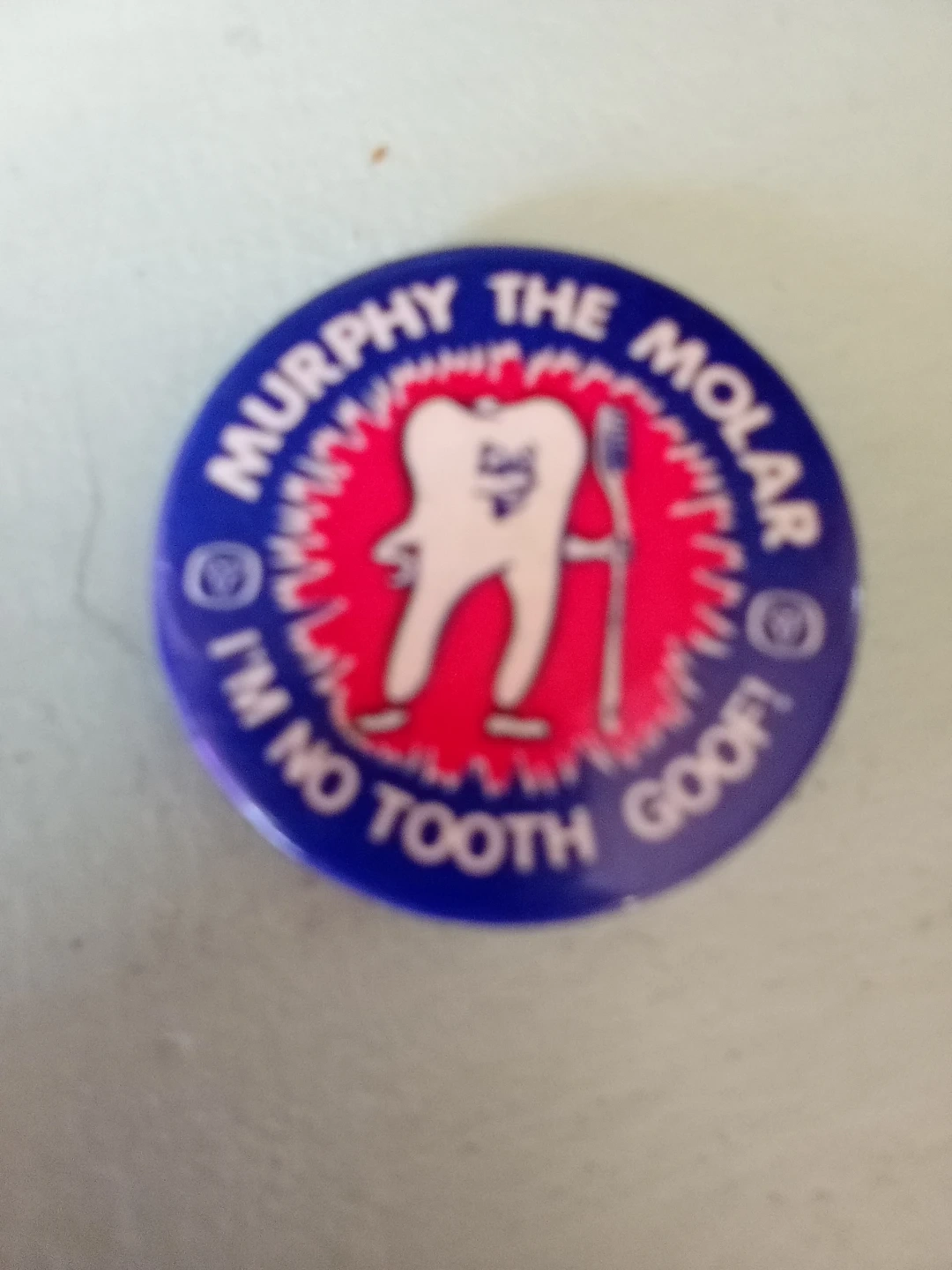 This is a fun button pin featuring Murphy The Molar. It reads "Murphy The Molar, I'm No Tooth Goof!". It's a circular blue pin with a red centre graphic. This would be a quirky addition to a collection or a fun accessory.