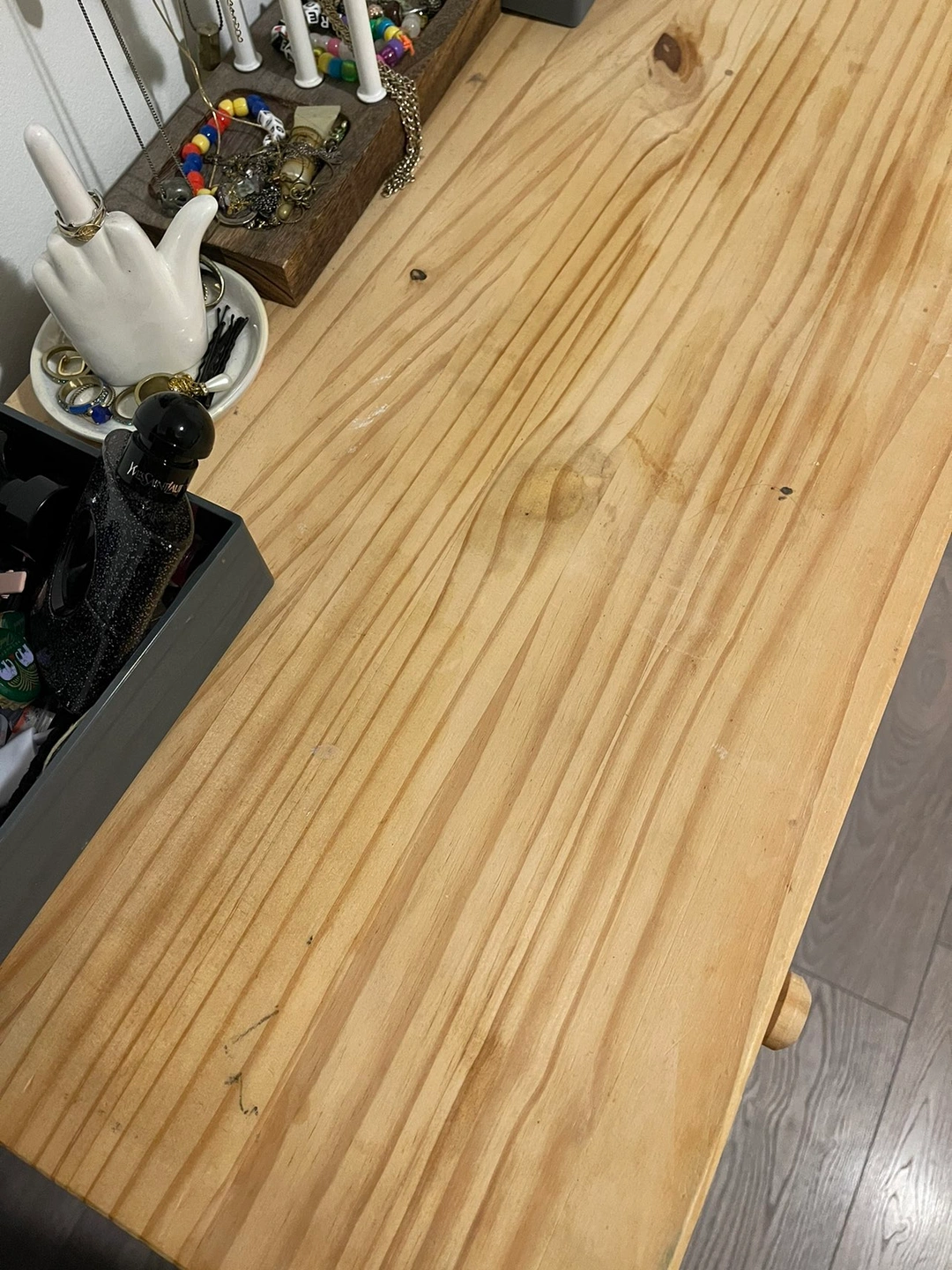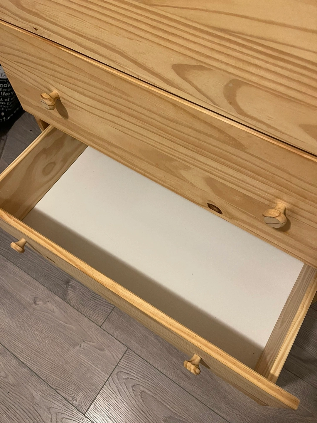 Dresser is solid unstained wood with legs. Drawers are great condition. The only thing is the minor stains on the top (5th pic) that can easily be sand/polish/wood stain if you want.