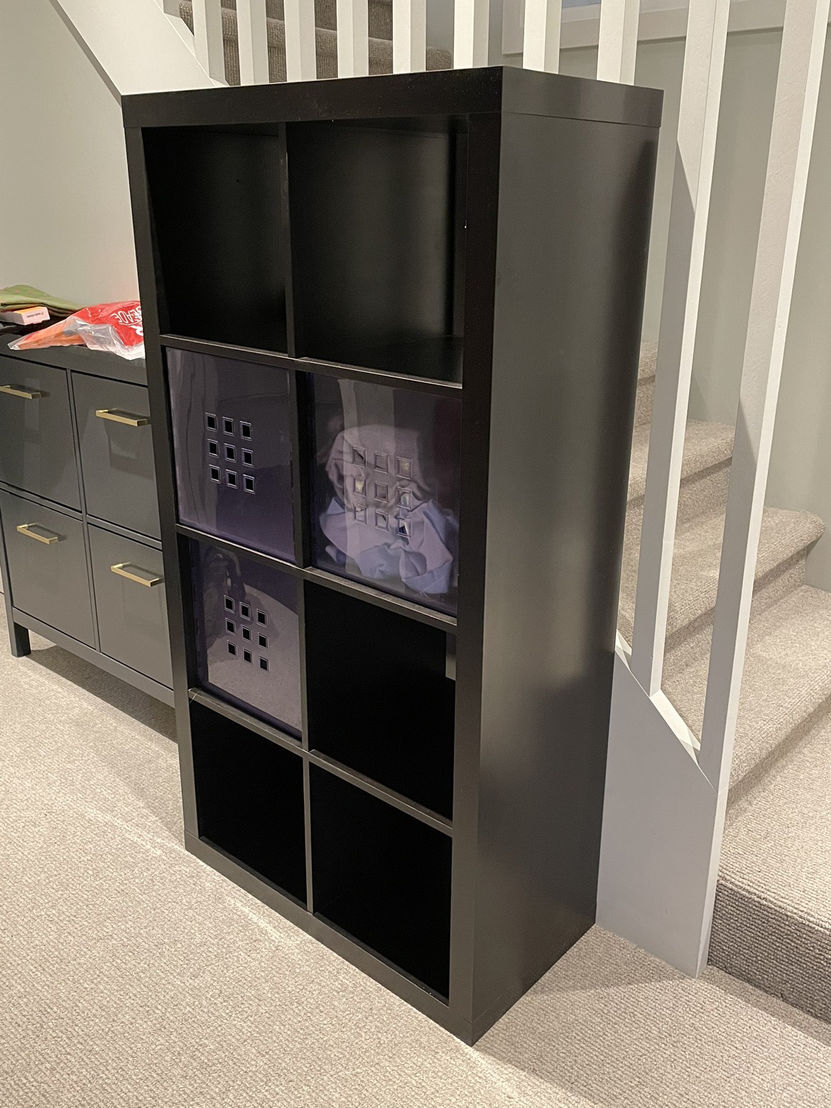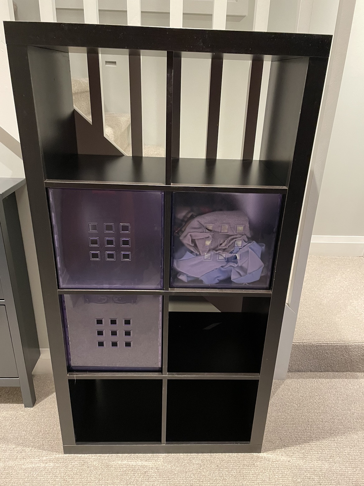 IKEA storage unit with three bins. https://www.ikea.com/ca/en/p/kallax-shelf-unit-black-brown-20275885/#content