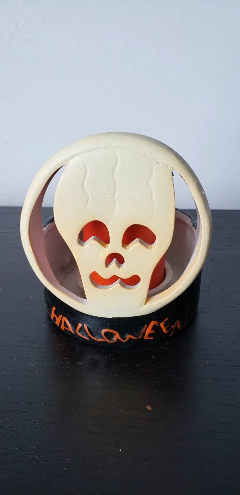 Ceramic Halloween projector. You light the candle and the skeleton face will be projected.