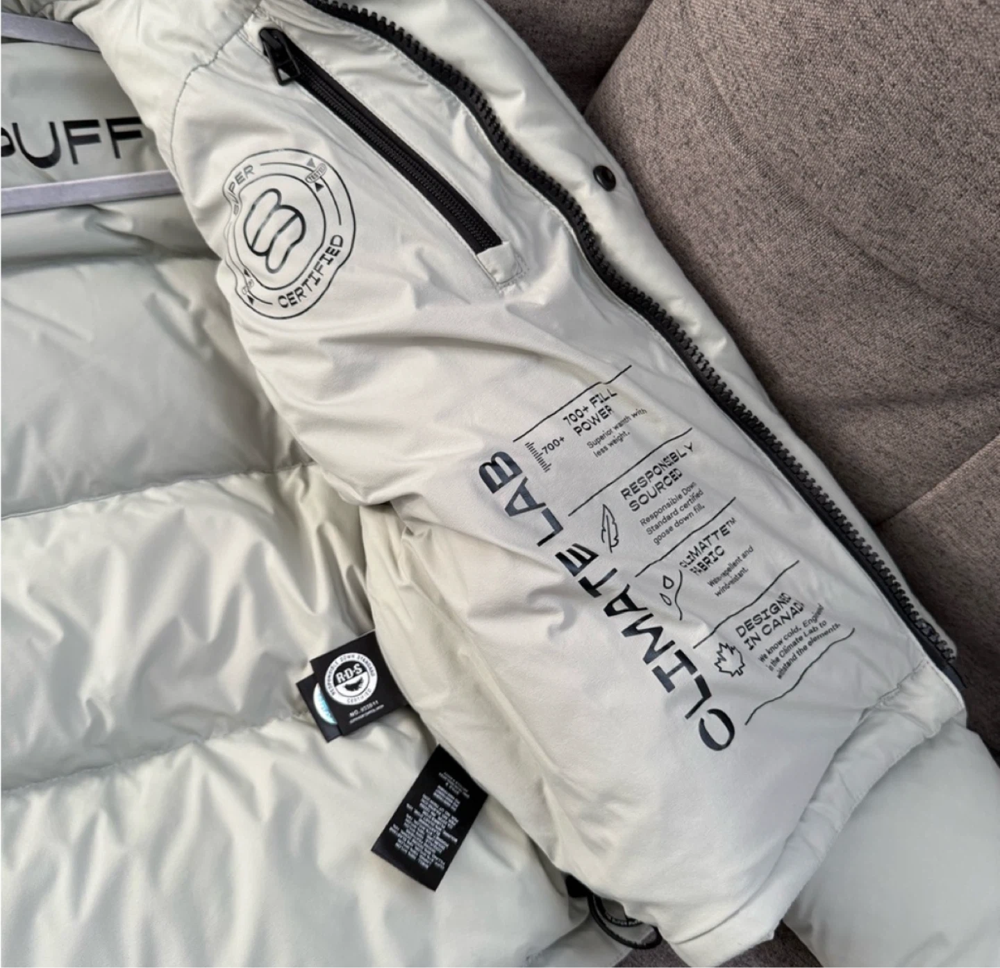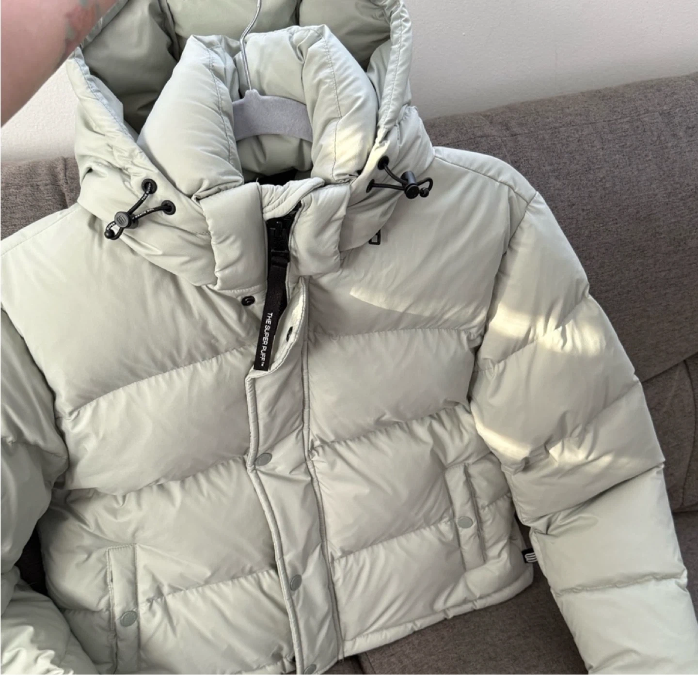 Selling my Aritzia Super Puff Shorty in size XS, color Dusky Green (stock photo added for color reference β shade appears slightly lighter in person).