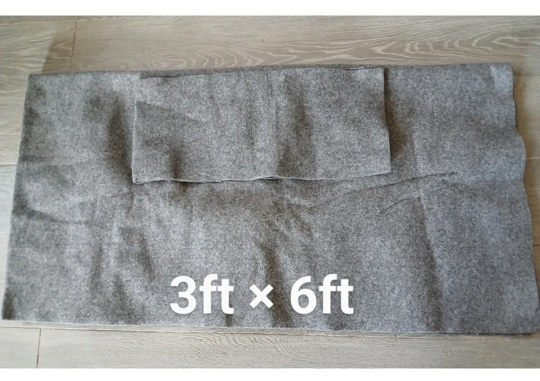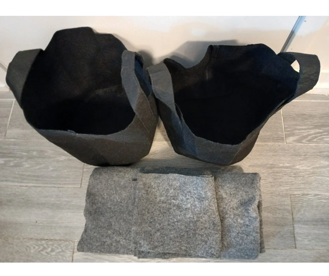 Two dark grey fabric grow bags. One grey weed barrier measuring 3ft x 6ft and another piece measuring 7 1/2" x 36". Great for gardening!