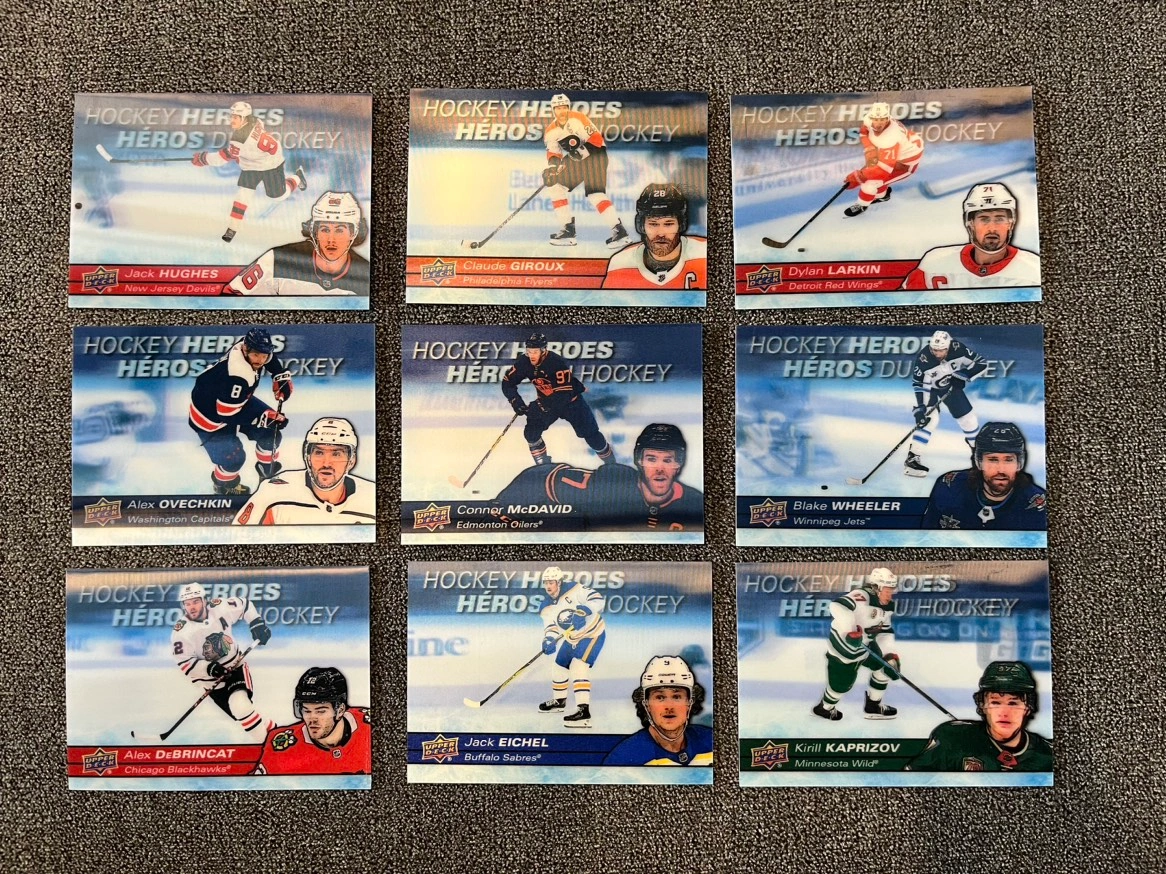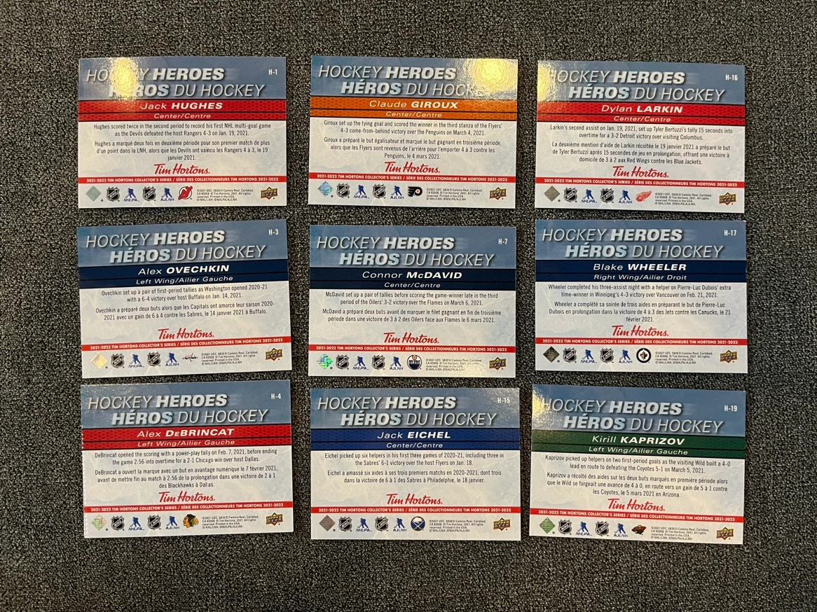 362021-2022 Tim Horton’s Hockey Hero’s Cards. Prices listed below. Also have tons of other doubles for this years. Please send me your list. H-1 Jacks Hughes $35 H-3 Alex Ovechkin $35 H-4 Alex DeBrincat $30 H-6 Claude Grioux $25 H-7 Connor McDavid $60 H-15 Jack Eichel $35 H-16 Dylan Larkin $30 H-17 Blake Wheeler $30 H-19 Kirill Kaprozov $30 Pet free and smoke free home