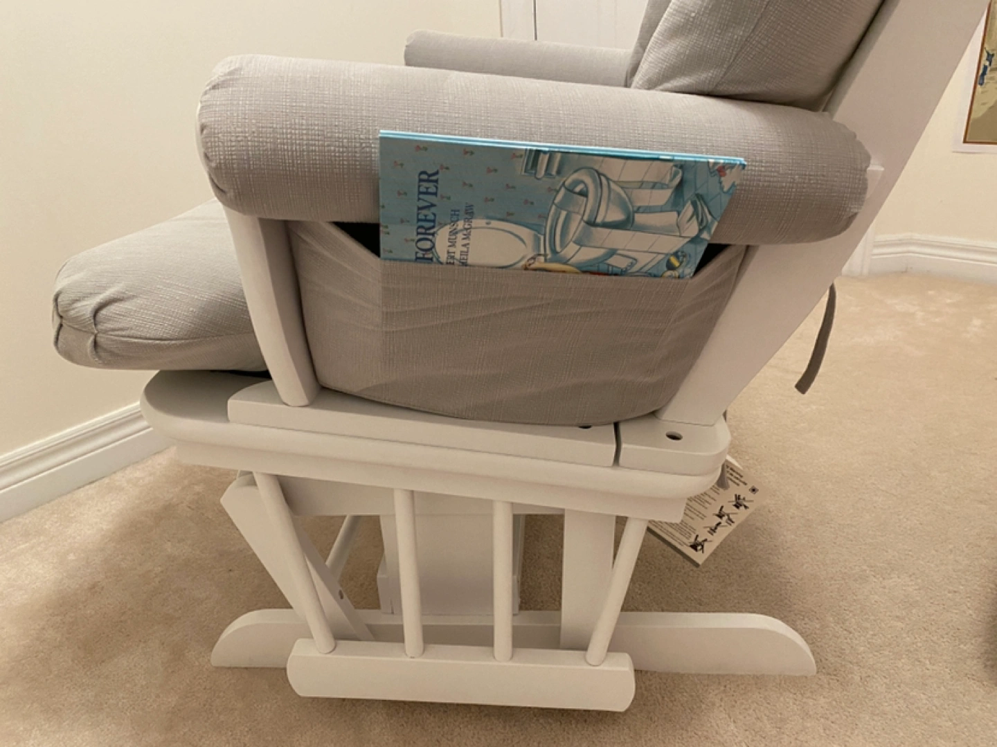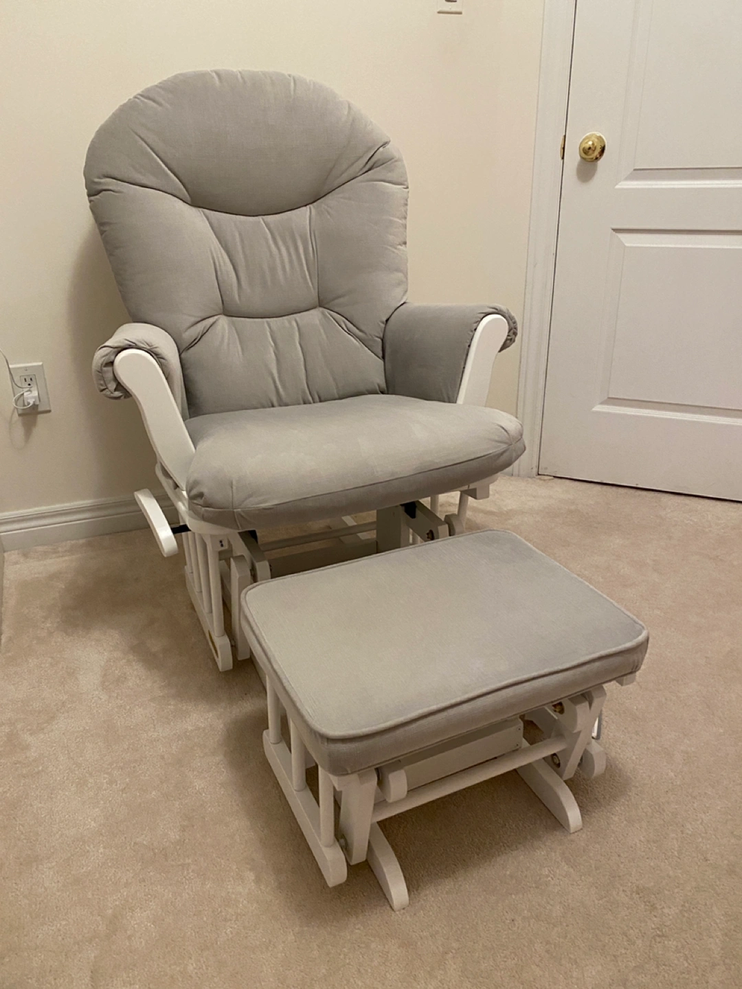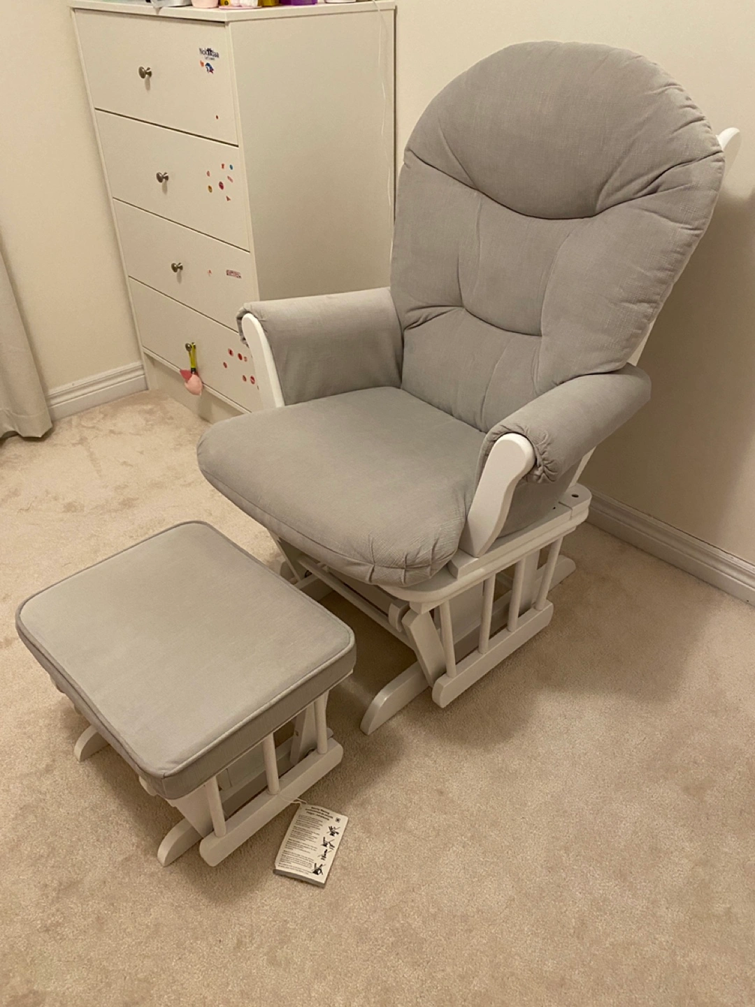 Shermag Glider and Ottoman set (rocking chair and rocking footrest) in grey/white with 2 side pockets. Great for nursery or living room. Excellent Condition. Smoke free and pet free home. Pick up only.