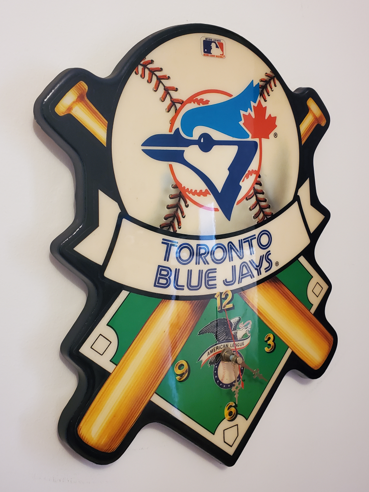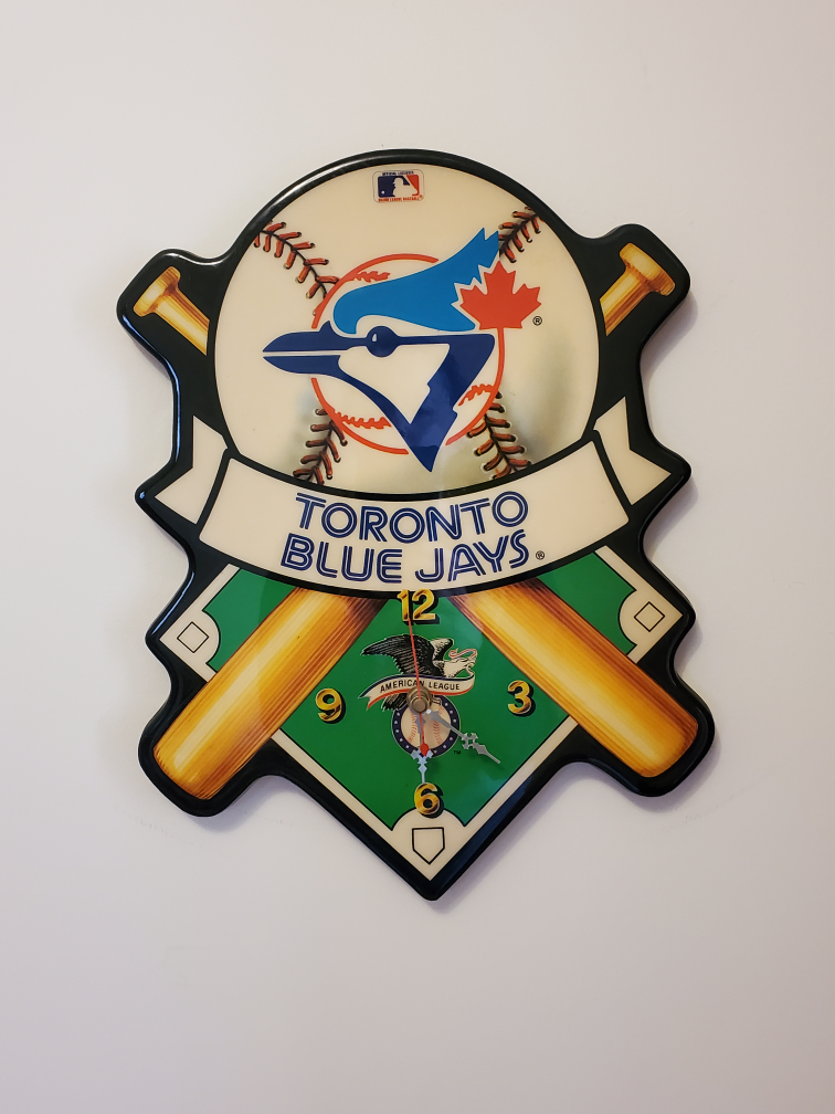 Hello, We are selling our "Toronto Blue Jays Baseball Team - Bats and Ball Diamond Shaped - Lacquered Wood Wall Clock" It measures 12" W x 15 1/4 H x 3/8 D", and is battery powered. It is in very near perfect condition. We are selling this item for $40. Please message me for more details or pictures. Shipping is available for an additional cost. Thank you