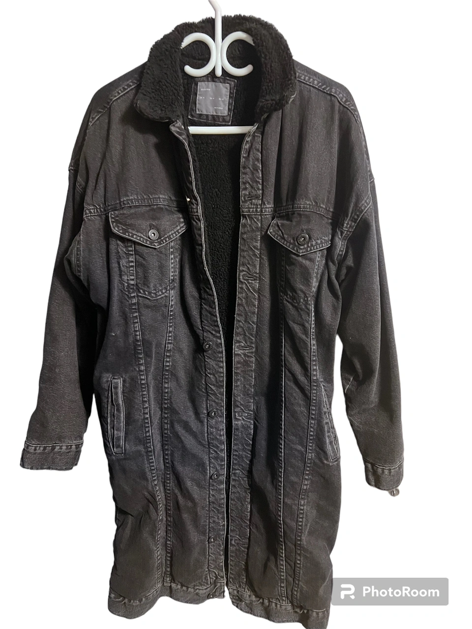 Fleece- lined, Black Denim Fall Jacket, below the knee- length, Size- medium