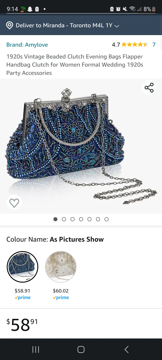 Beaded evening bag/purse. Bought it to go to an event that I couldn't attend. It was never used though I did take it out of the packaging it was in. It can be used 2 ways, handheld or on your shoulder. The Amazon pic shown is for actual price reference. SFPF home. Pickup at Greenwood and Danforth. Please check my other listings to bundle with more cool stuff.