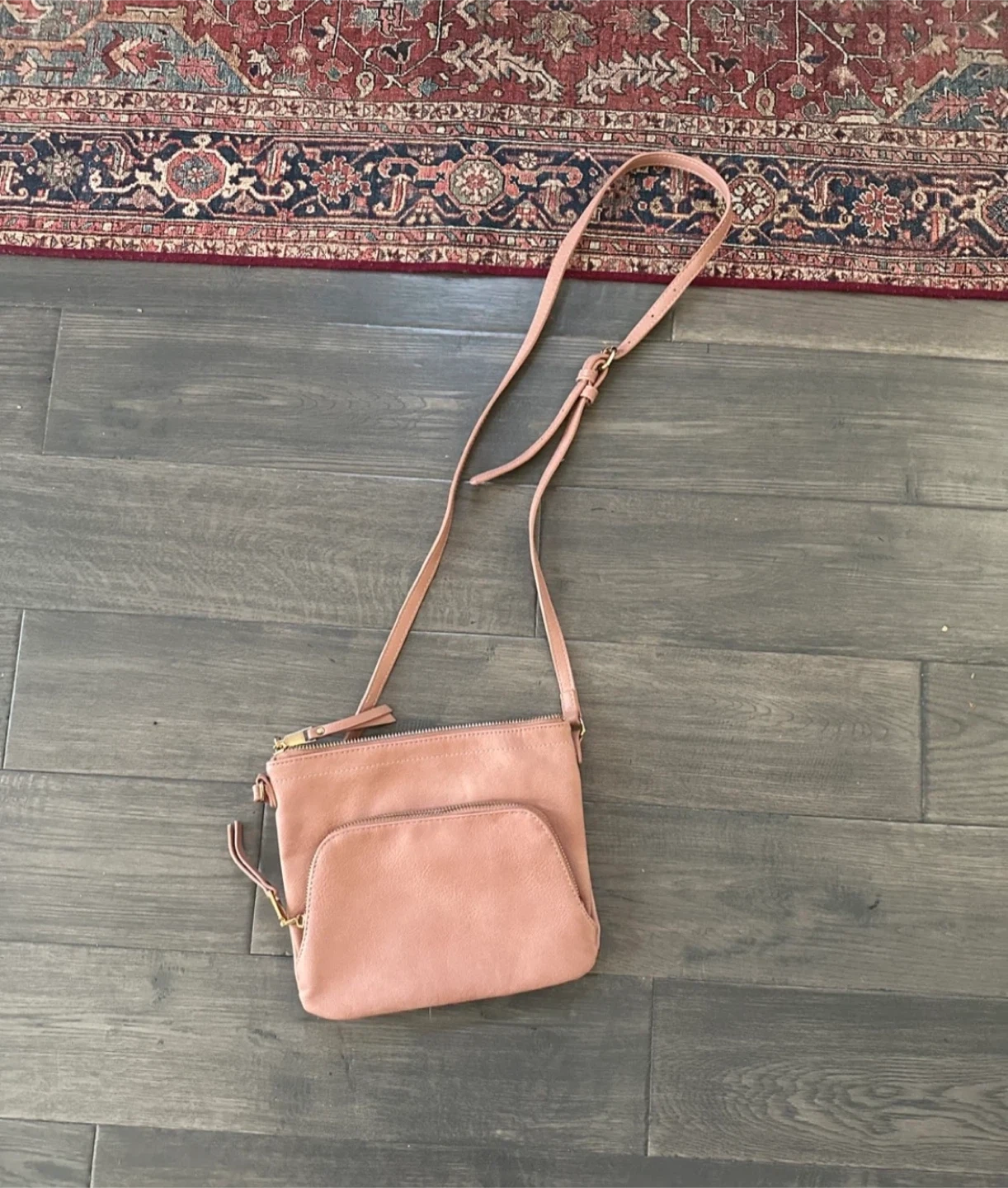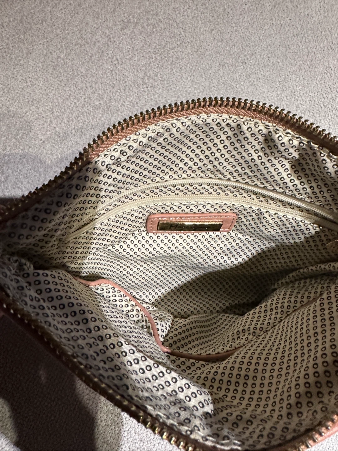 Cute pink crossbody purse with gold accents. It has a main zippered compartment and an additional front pocket. The interior lining has a fun patterned design.