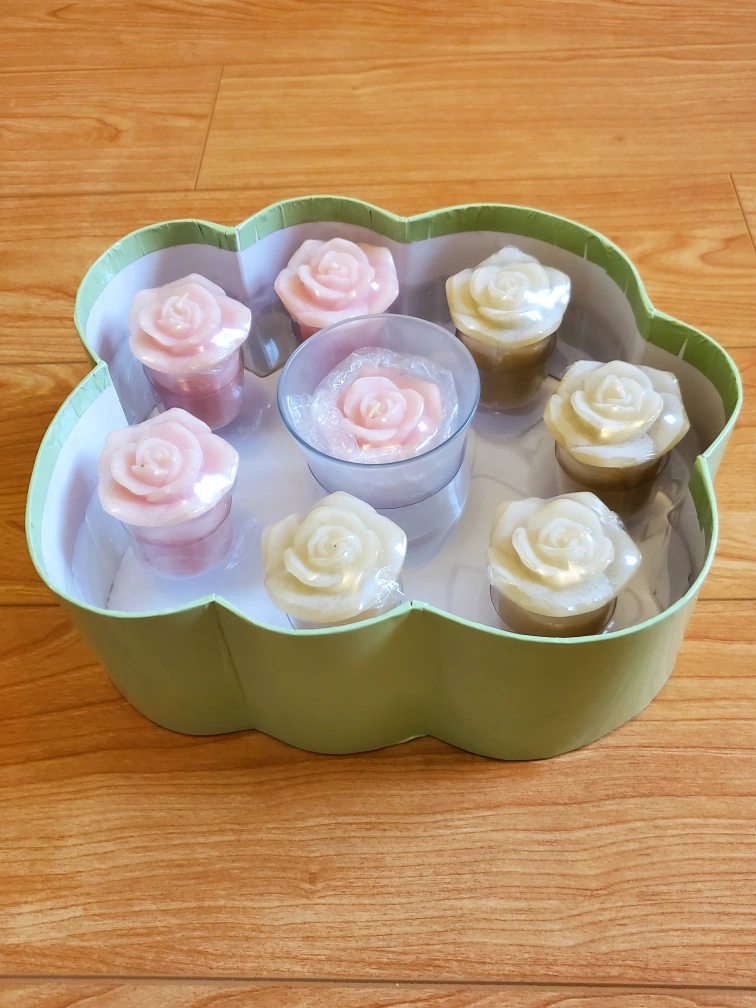 I'm selling this brand new box of Carlton Cards rose-shaped and scented votive candles. It also comes with a clear glass votive candle holder.