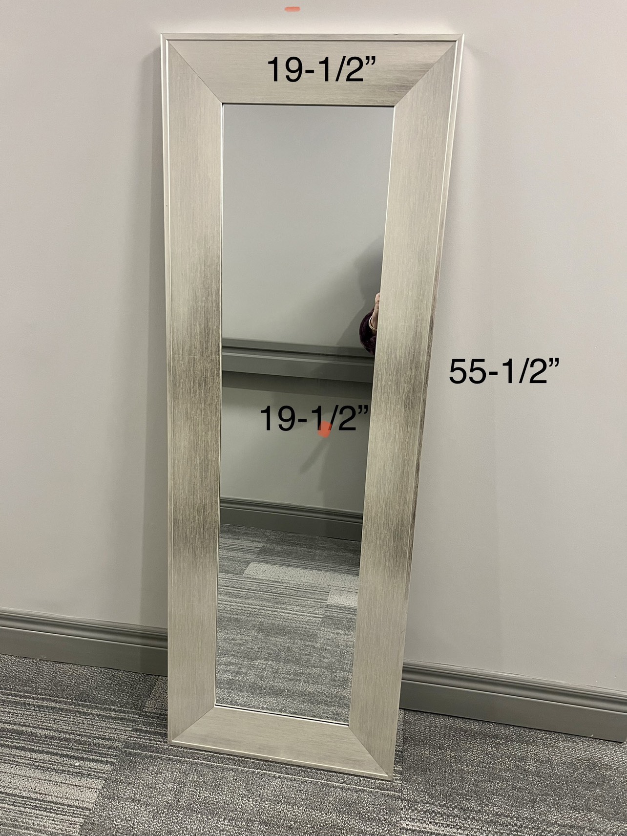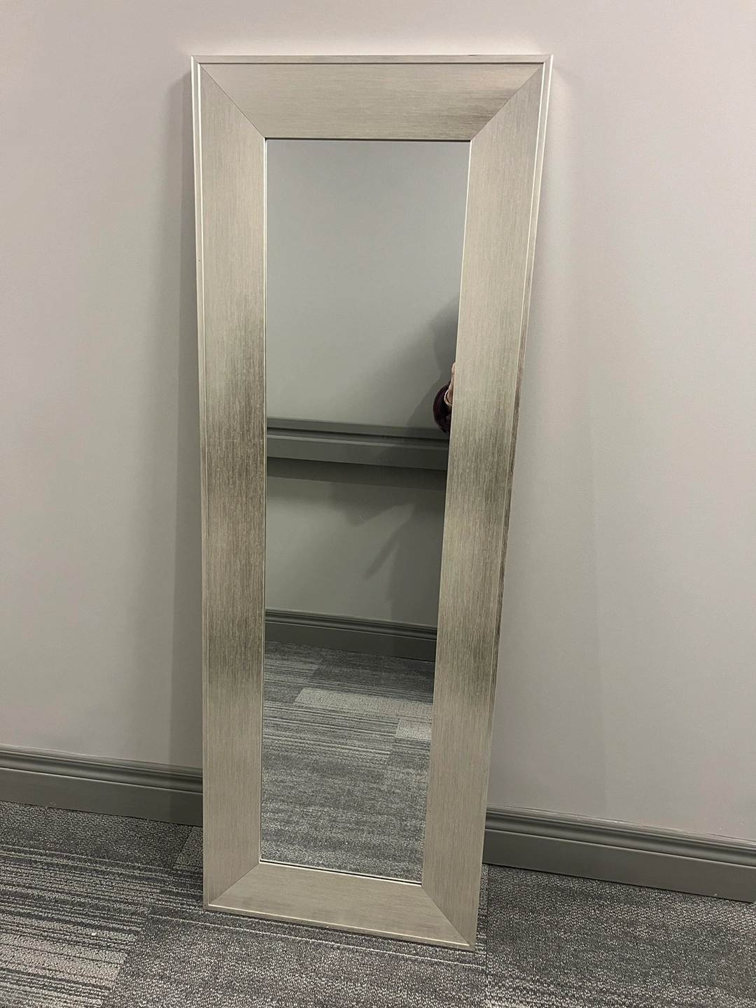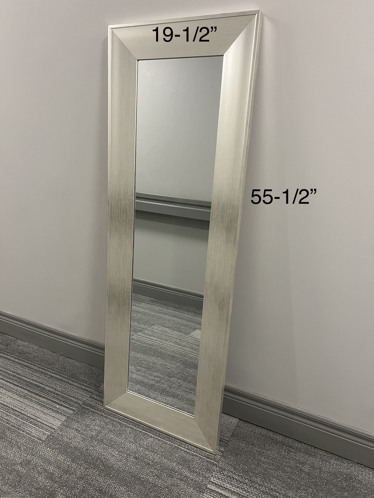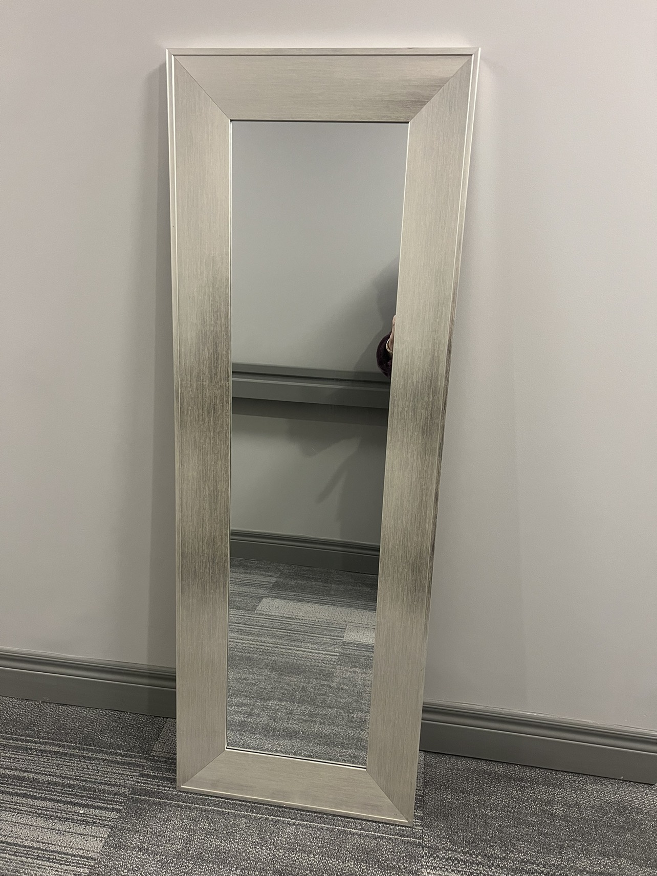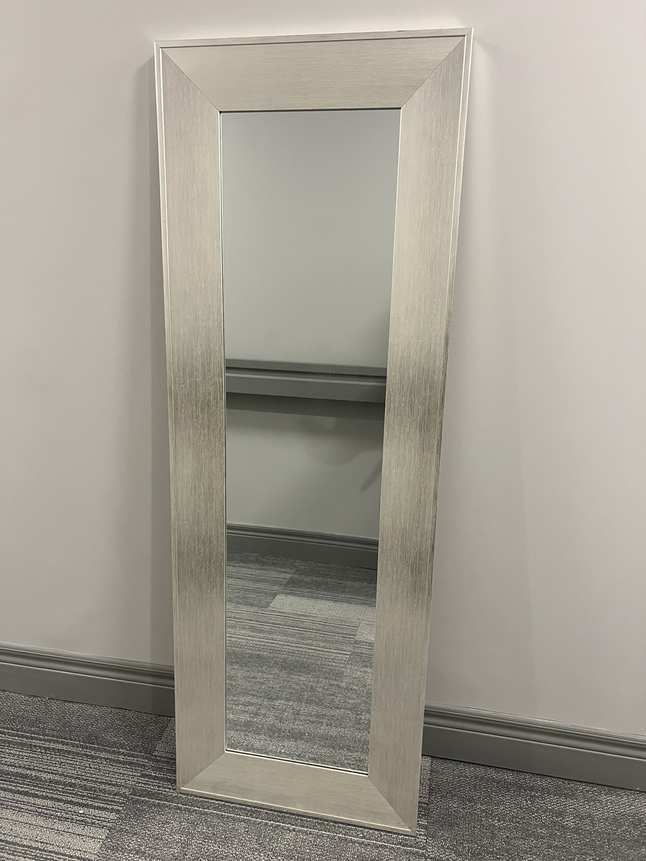 Full length mirror in chrome/silver color, can be standing or mounting over the door