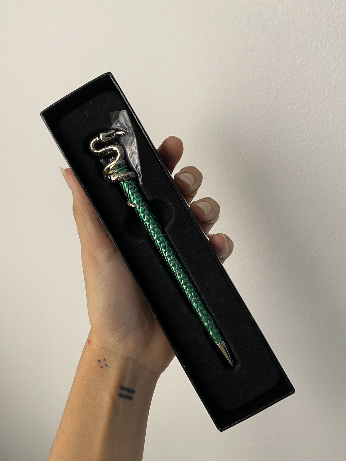 The Noble Collection Harry Potter - Hogwart House Pen - Slytherin Silver Plated Pen Material: Metal Crafted with exquisite details Created by The Noble Collection Bought it straight from The Wizarding World of Harry Potter