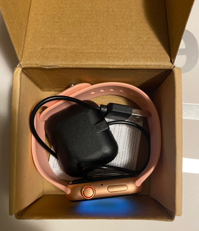 Smart watch that can be linked to smart phone. Soft pink strap that’s comfortable to wear. Fully functional. Used once to try it but haven’t found myself using it. Comes with box and charger.