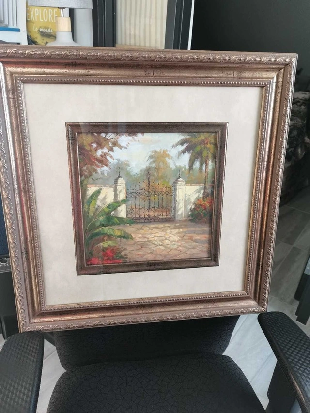 This is a framed piece of art that would look amazing in any room! It is in good condition, and ready to be hung up on the wall. Beautiful court yard theme. * Frame Dimensions: 24" x 24" * Art Dimensions: 12" x 12" If the ad's still up, the art is still available; pu showroom in chinook mall area