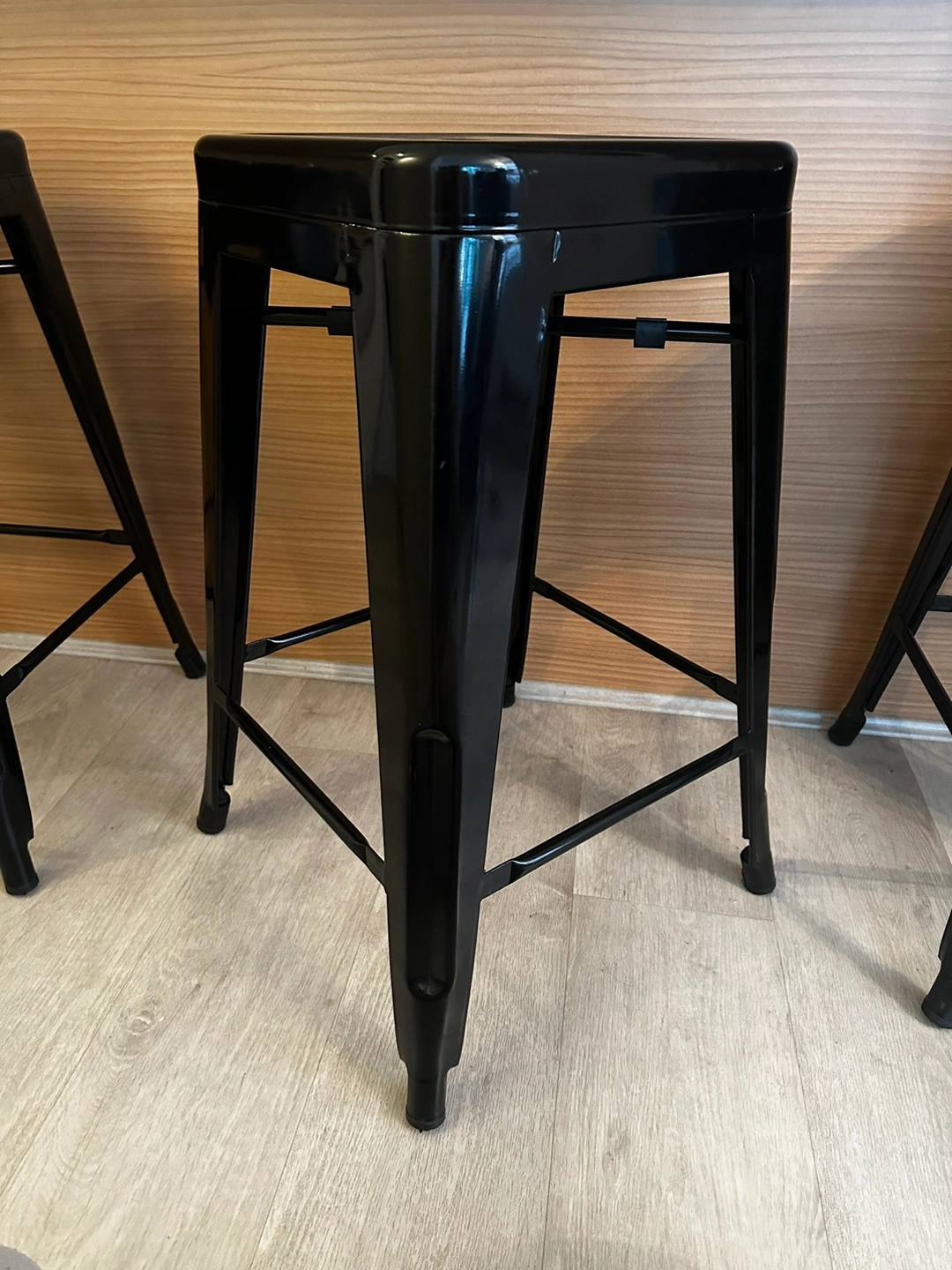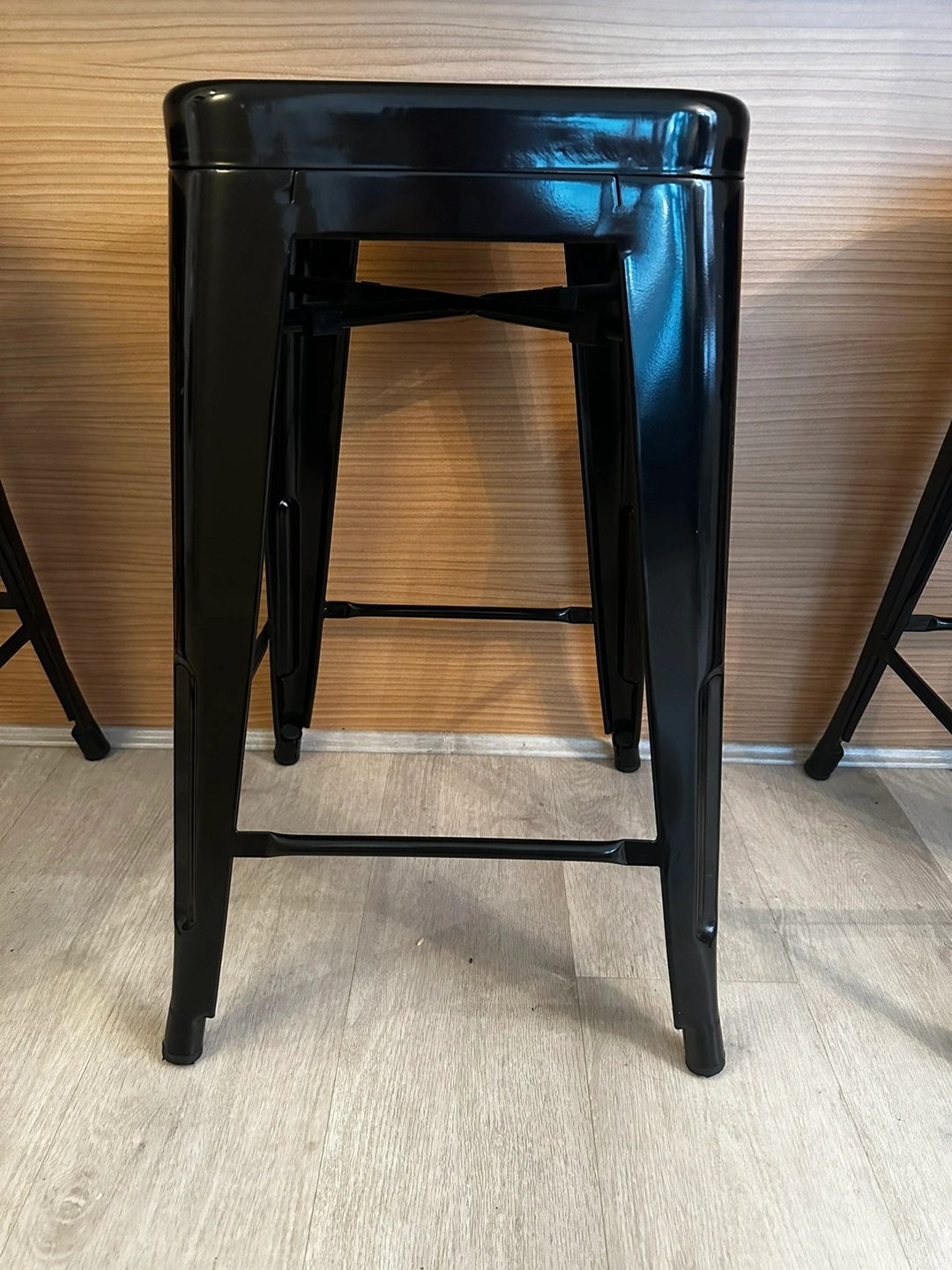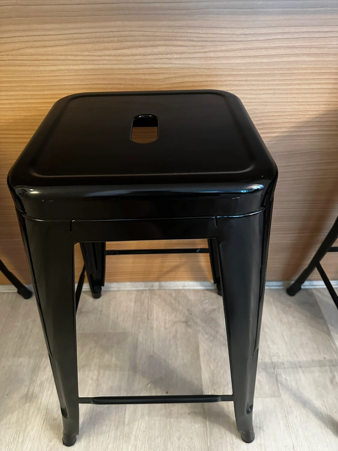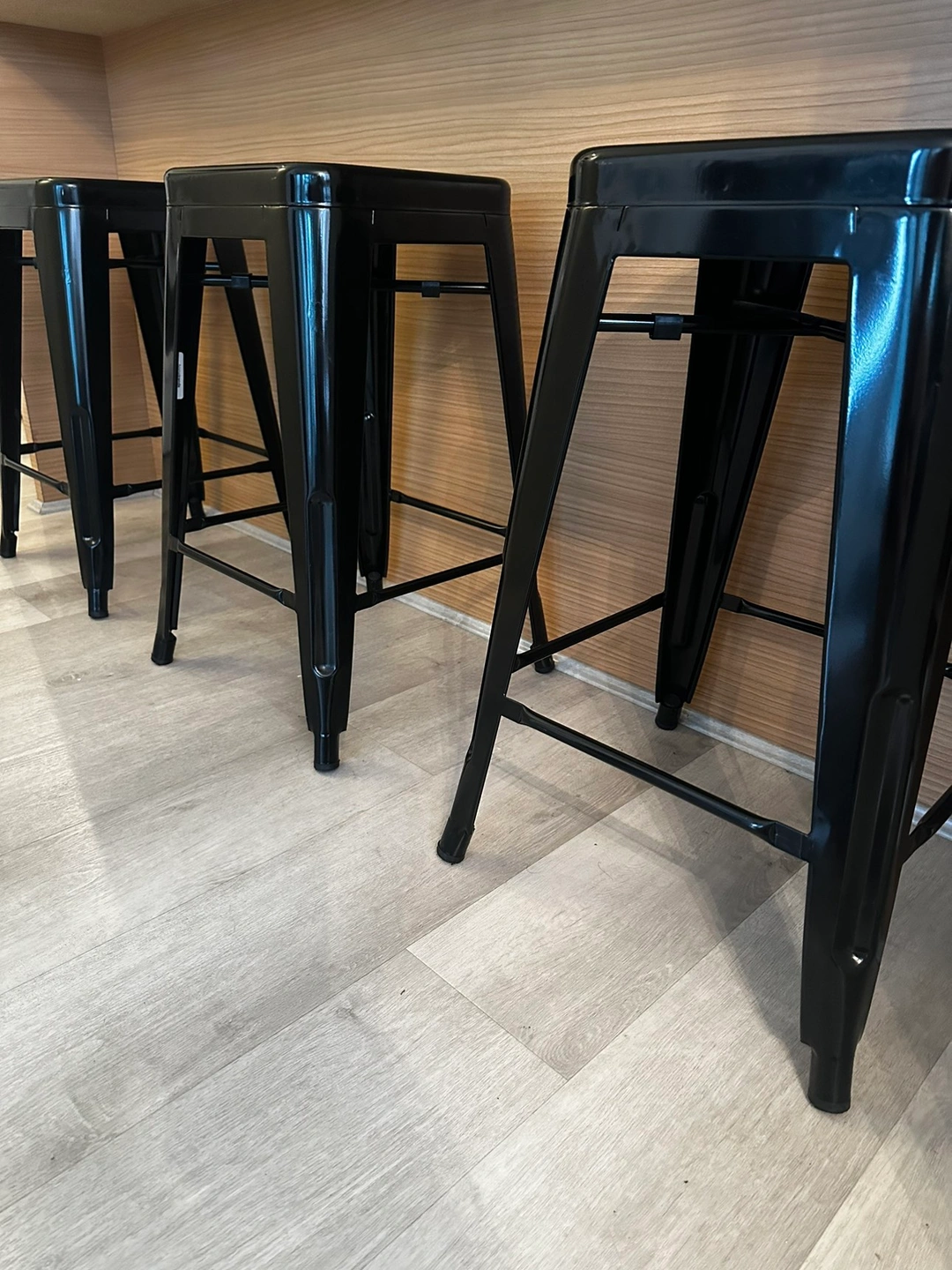 Bought 1 year ago for 60$ per stool. asking for $20 per stool or $50 for all 3. Glossy black finish. Great for counter tops 24inch to 27inch! lightweight and sturdy! Easy to wipe down and tuck away or stack!