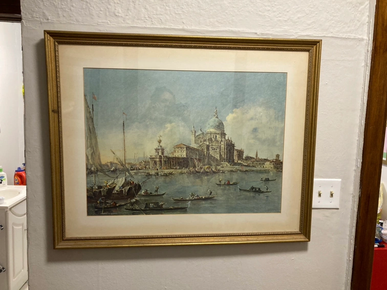 Large vintage artwork. Print of Painting titled "Venice: The Punta della Dogana with S.Maria della Salute" by Italian Artist Francesco Guardi dated 1770