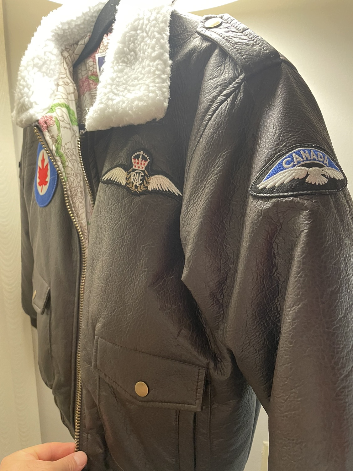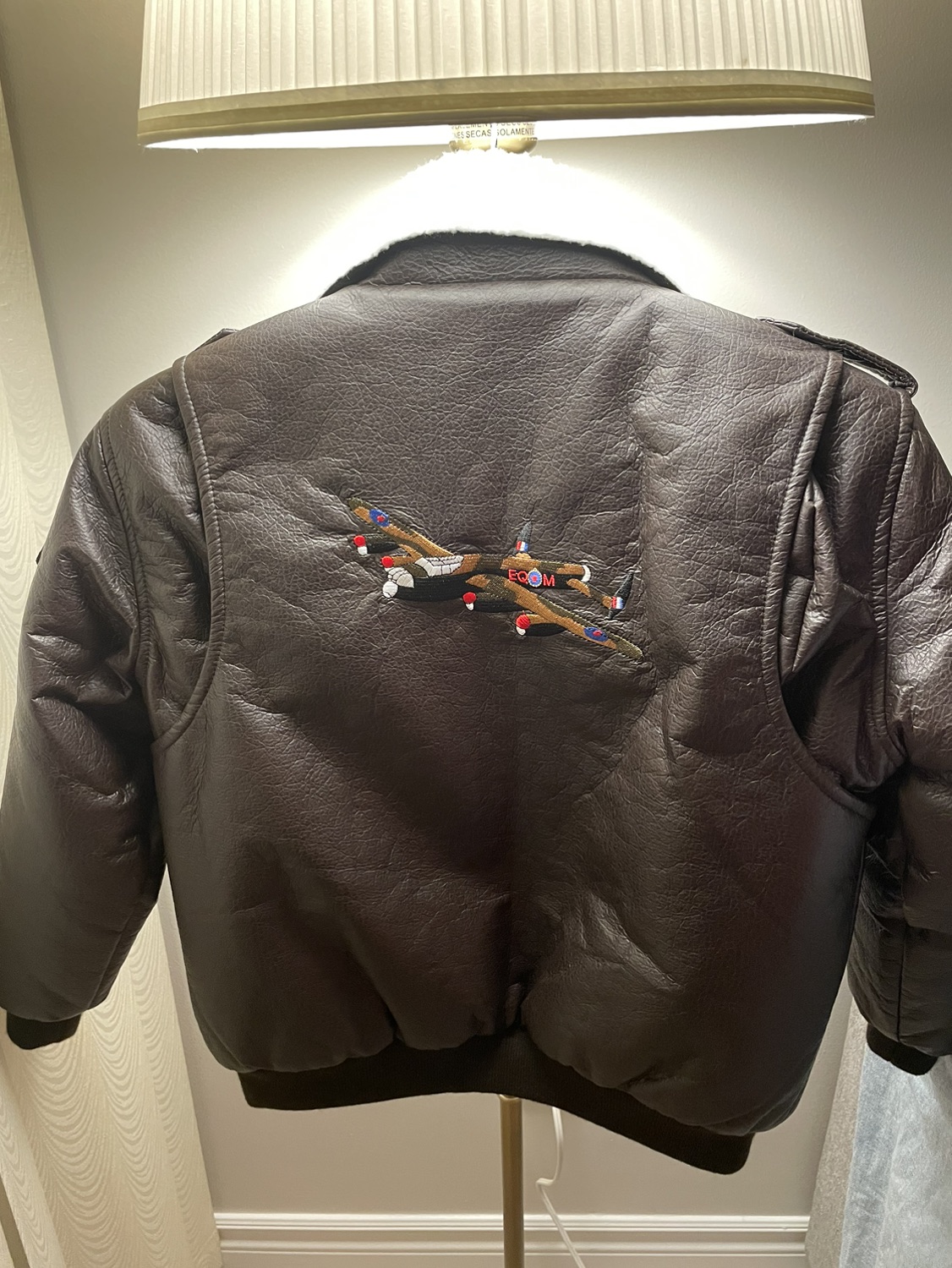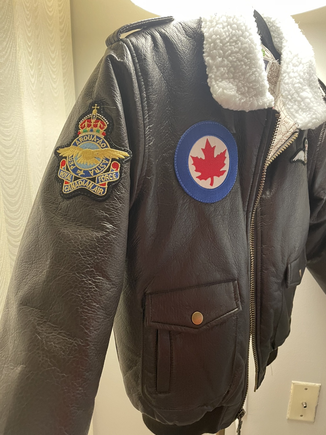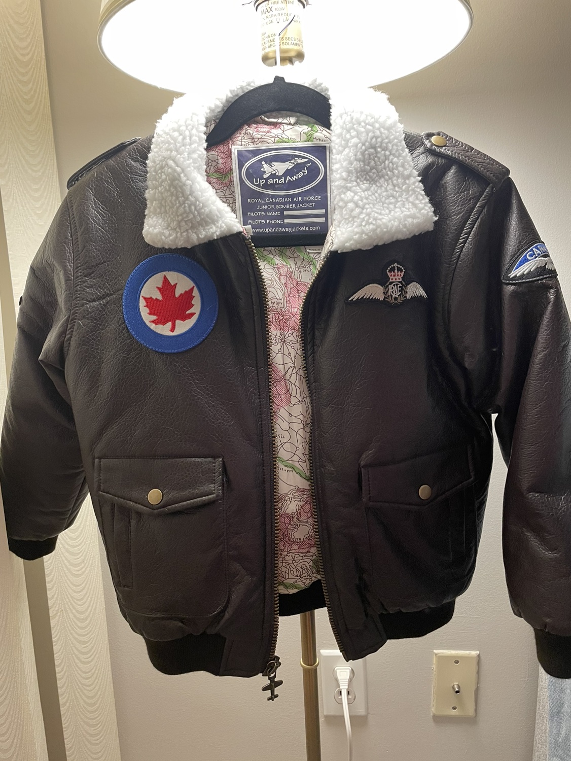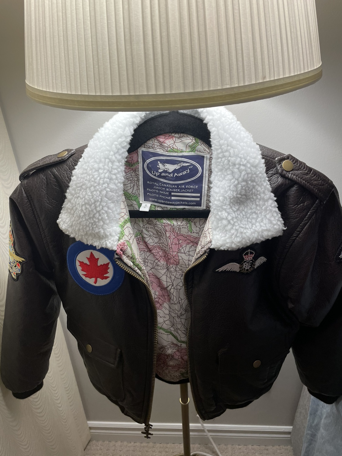 150Brand new Royal Canadian Air Force bomber jacket for the age between 6-10 years Genuinely designed with Sherpa collar and leather-like fabric Four decorative patches and big plane embroidered on the back ;military map styled interior lining Smoke and pet free home Bayview and sheppard intersection Thank you