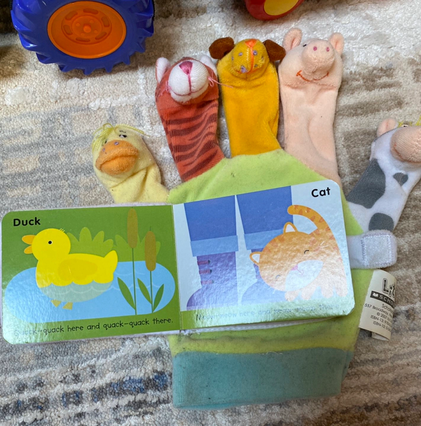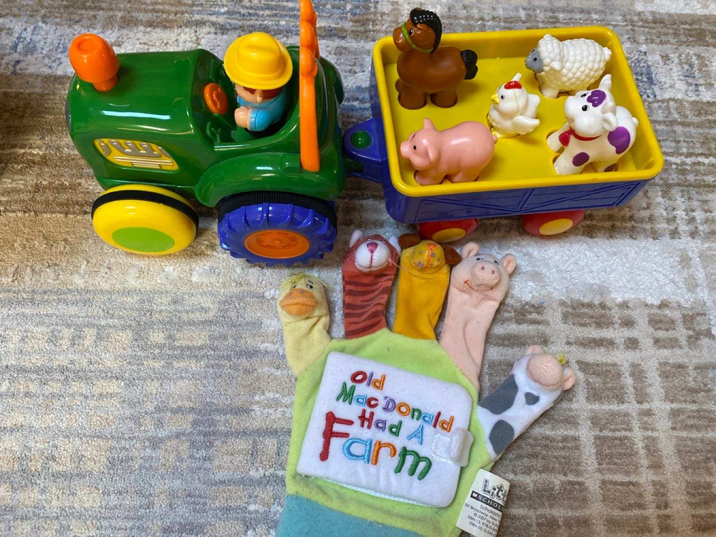 One Old MacDonald animal truck (battery run, battery not included) sings the song and moves. One finger puppet with a mini book. No negotiation and pick up only in Thornhill.