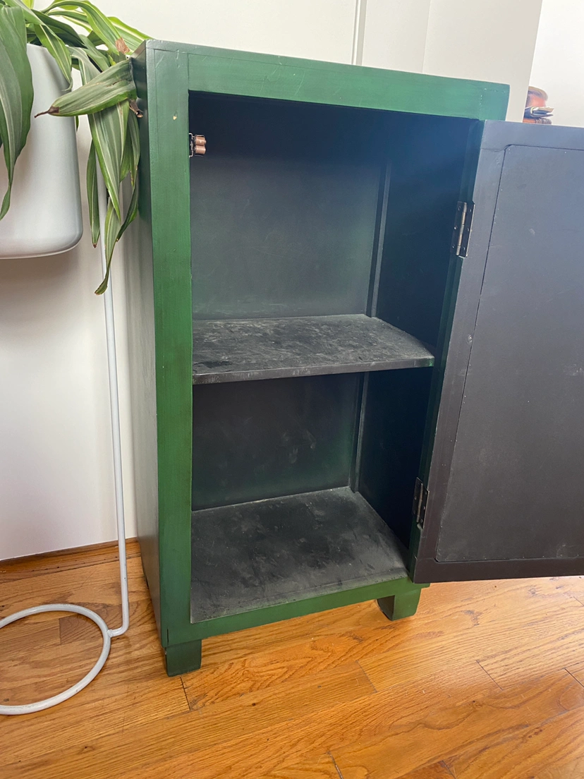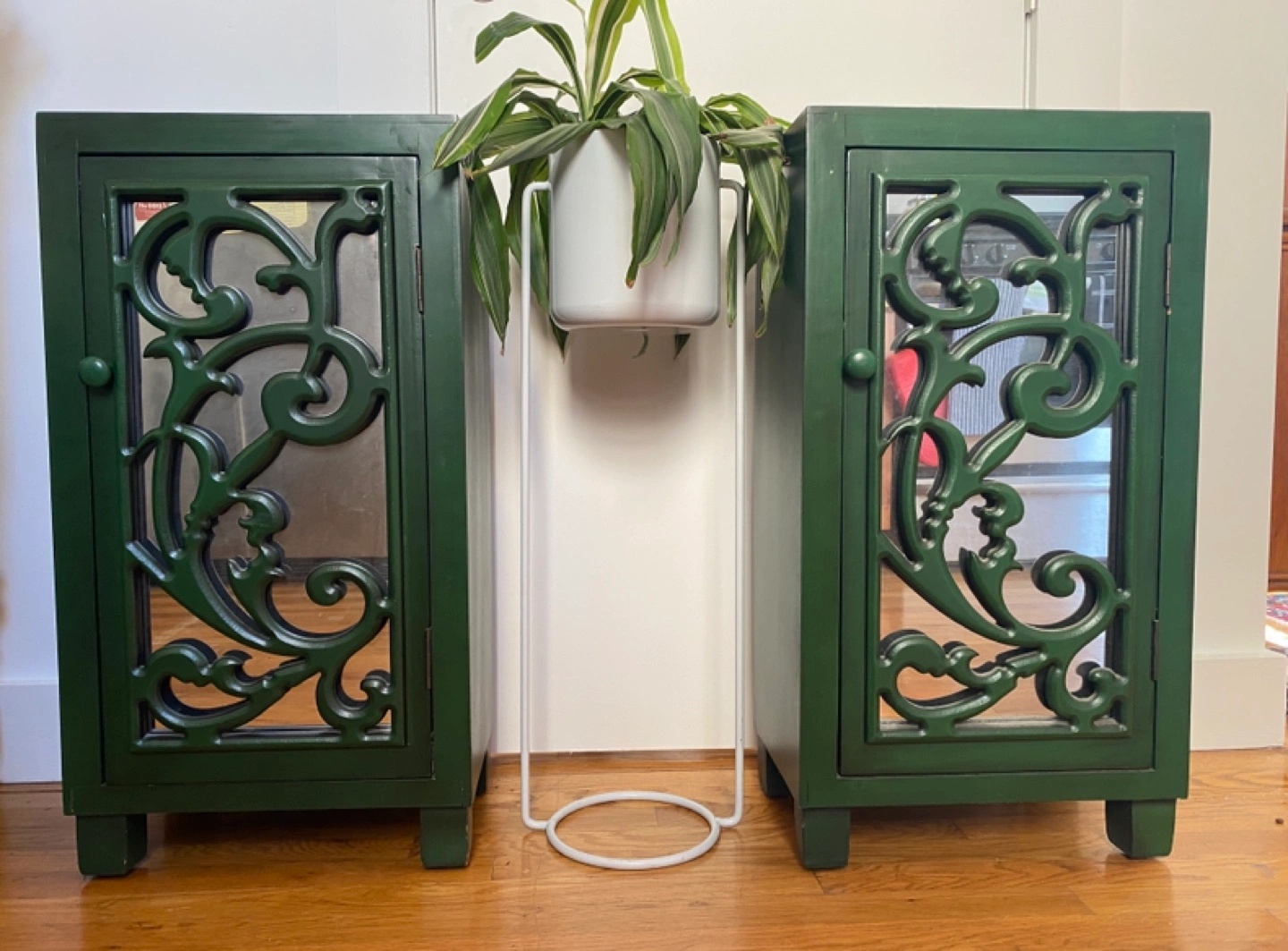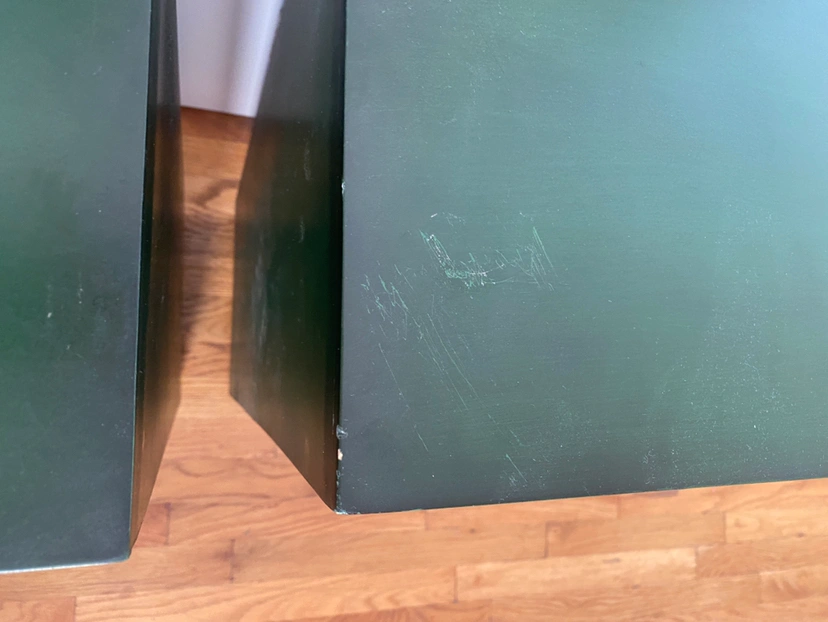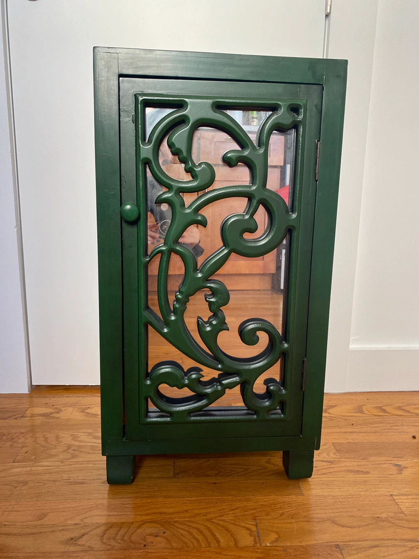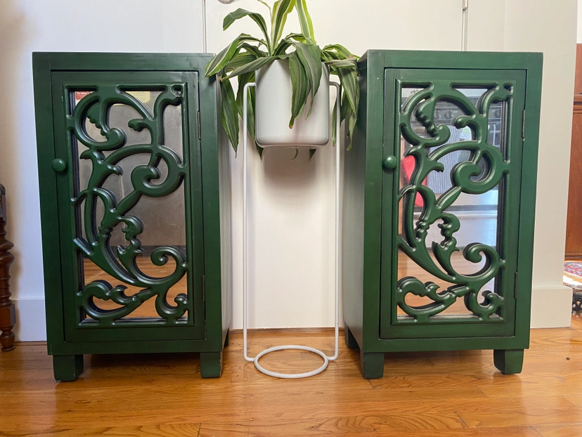 Two emerald green mirrored cabinets, two shelves in each. A few tiny scuffs.