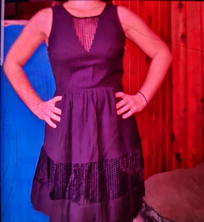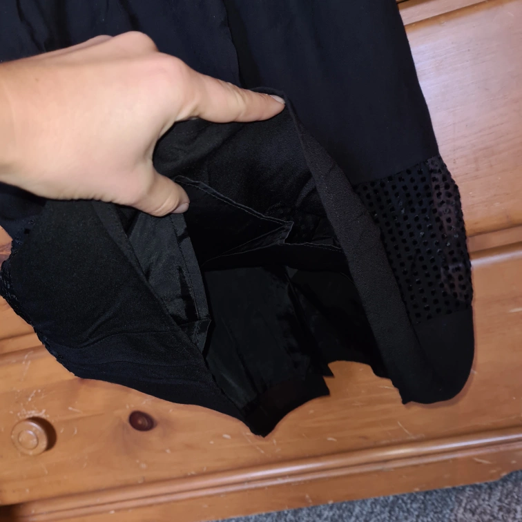 Black sheer material with a square pattern on the clivage, on the back below the shoulders and at the bottom of the skirt.