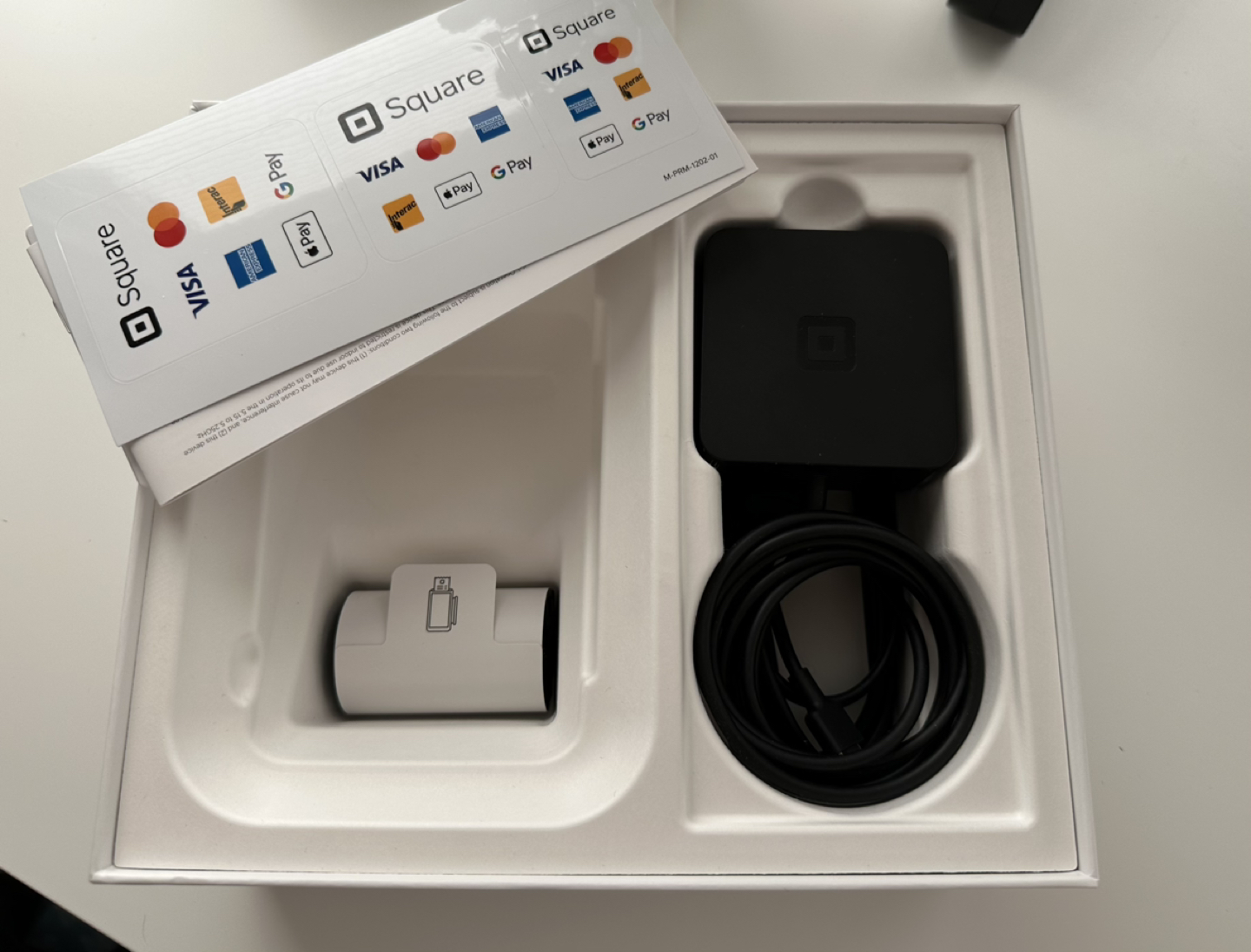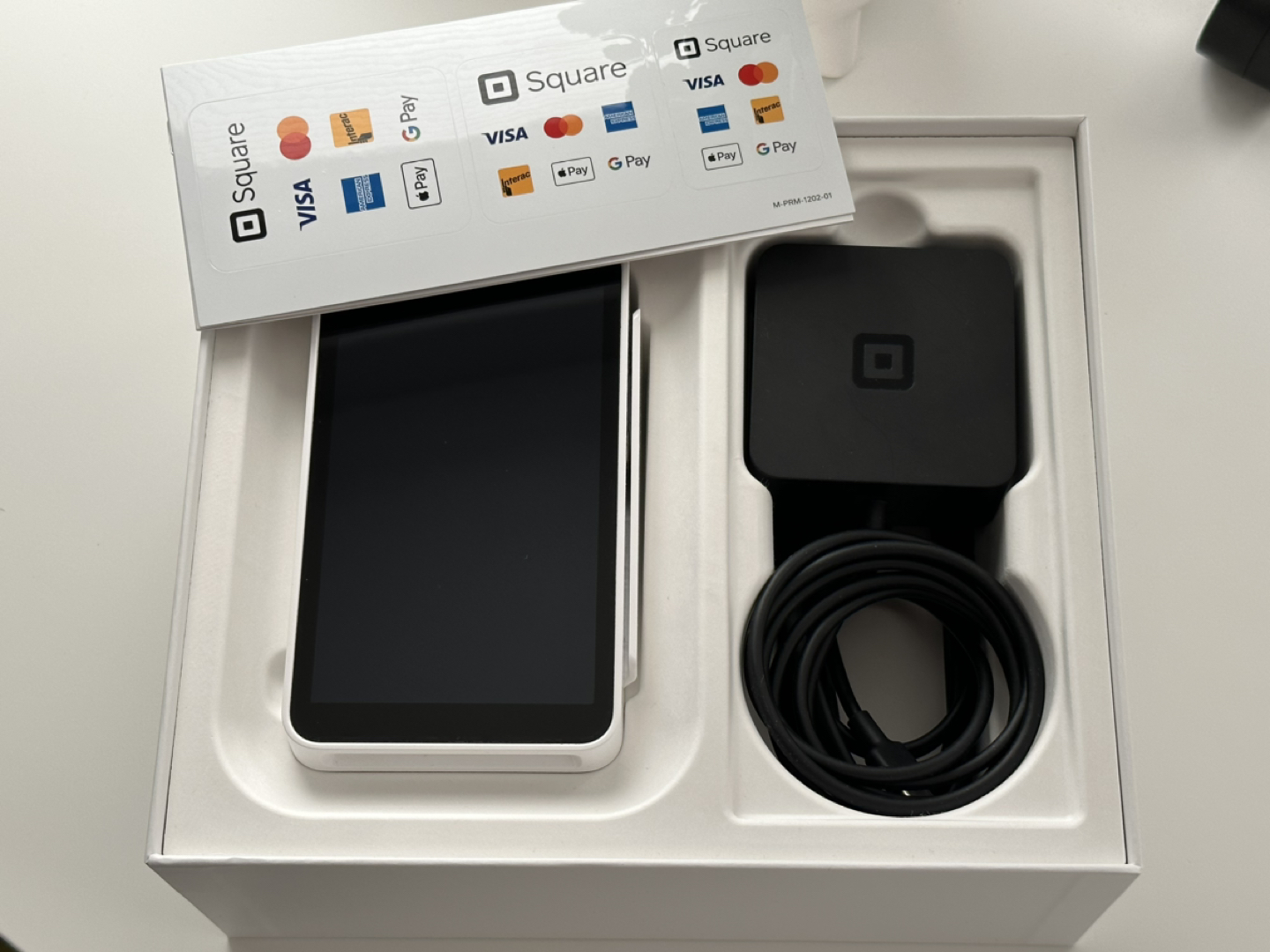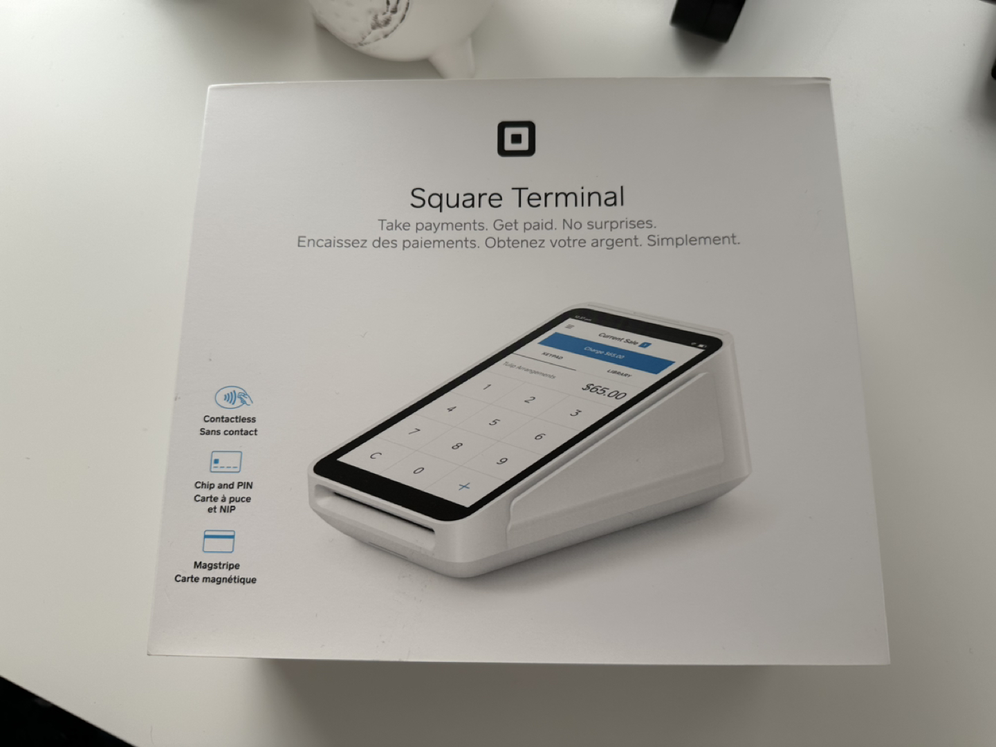 Square Terminal in excellent used condition. Includes original box, charging cable, one roll of receipt paper, and stickers to display at your business. This POS machine accepts any type of payment method, including debit tap and chip and PIN.
