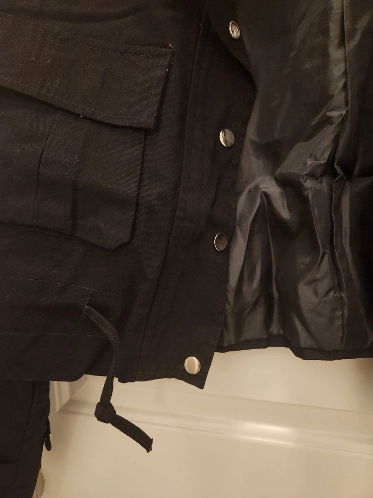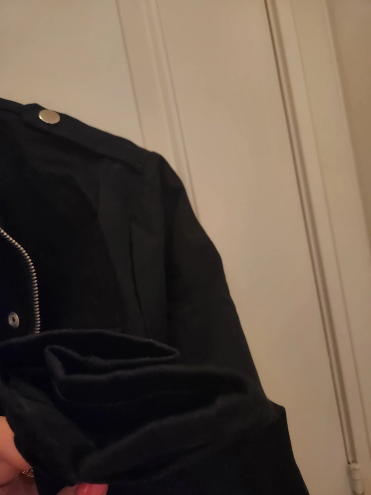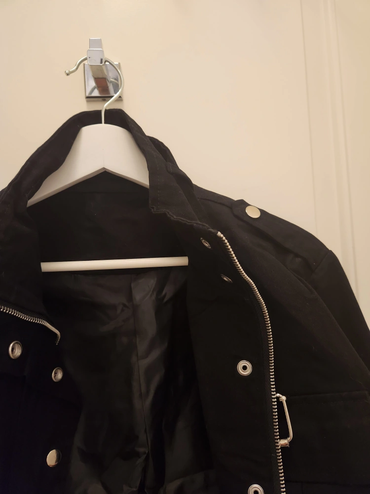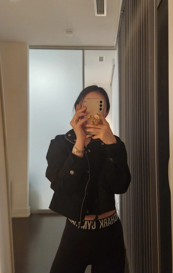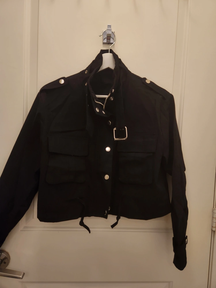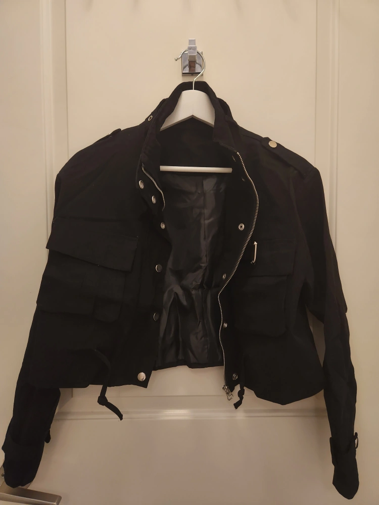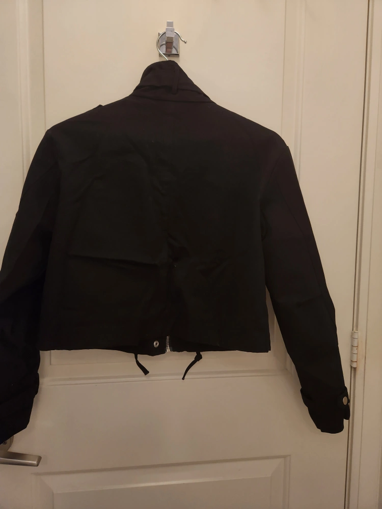 New Black cropped jacket purchased in Korea. It can be used as an outer in spring and fall, and you can layer it with other clothes in winter. The material doesn't wrinkle easily, but it has some wrinkles as it was folded after purchase.