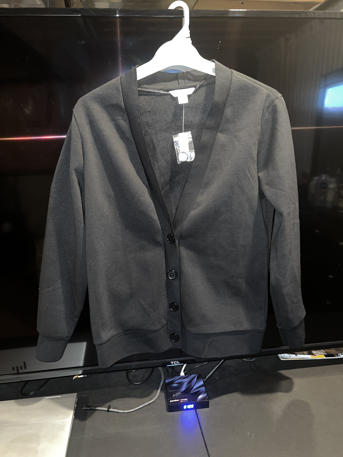 *firm price* Selling a black cardigan that is brand new that has never been worn, it also includes an extra button. The size of the cardigan is an extra small. I am selling this item because it cannot fit me.
