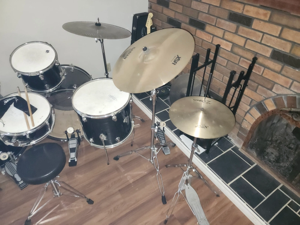 Complete 13-piece drum kit. Includes bass drum, snare drum, toms, cymbals, hardware, and drum stool.