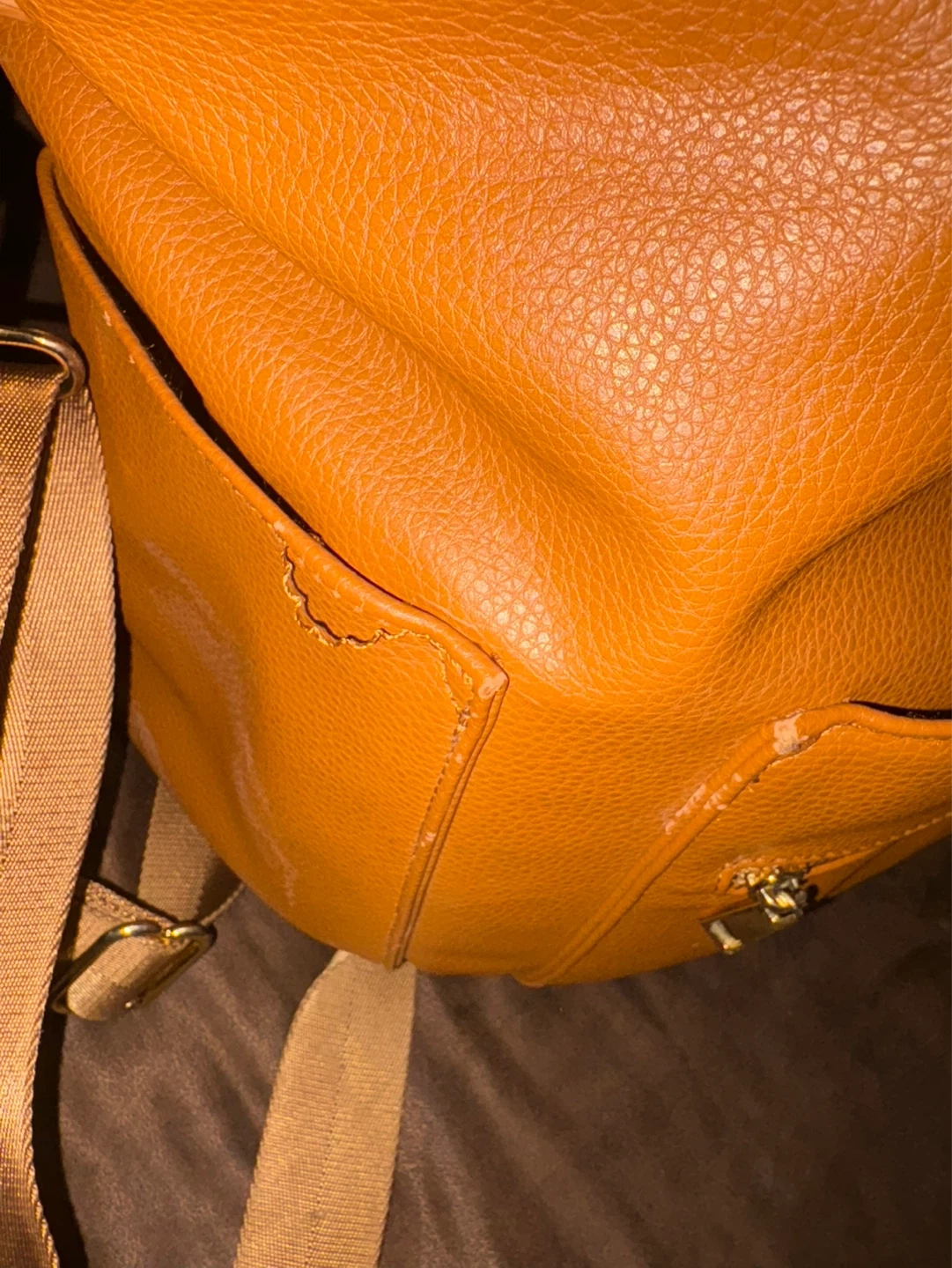 This FAWN Diaper Bag is made from durable faux leather and can be worn as a backpack or messenger bag. It features 6 exterior and 5 interior pockets, plus a half-round zipper for easy access. Some wear and tear is visible on the faux leather edges.