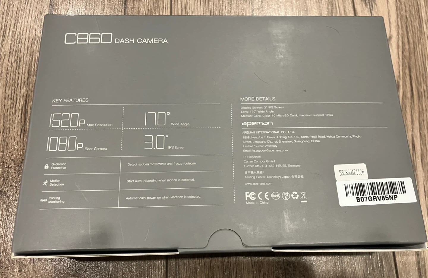 This Apeman C860 dash camera features a 3" IPS screen with a 170° wide-angle lens. It supports 1440p resolution for the front camera and 1080p for the rear camera. It includes G-sensor protection, motion detection, and parking monitoring functions. The package includes the main camera, rear camera, suction mount, and car charger/rear camera cable.