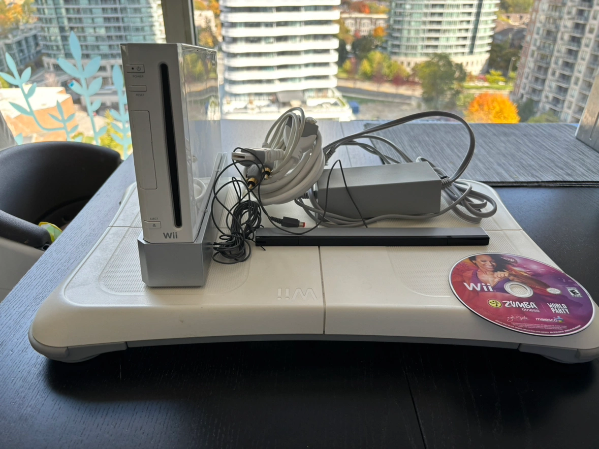 Wii console with the necessary cables. Includes the sensory bar, Zumba fitness game, and a balance board.
