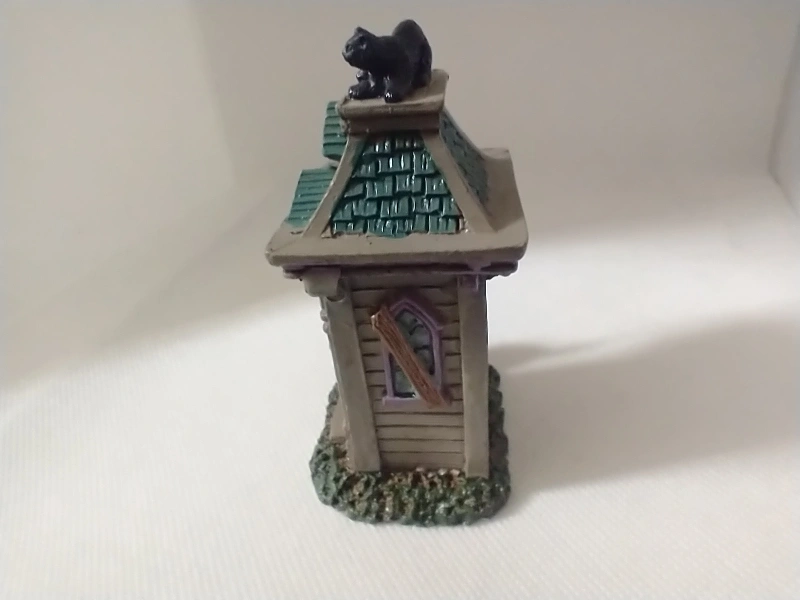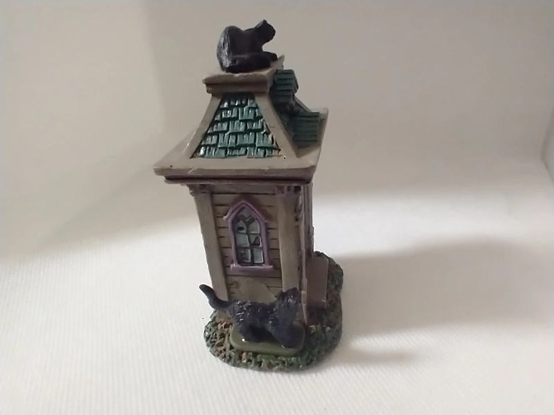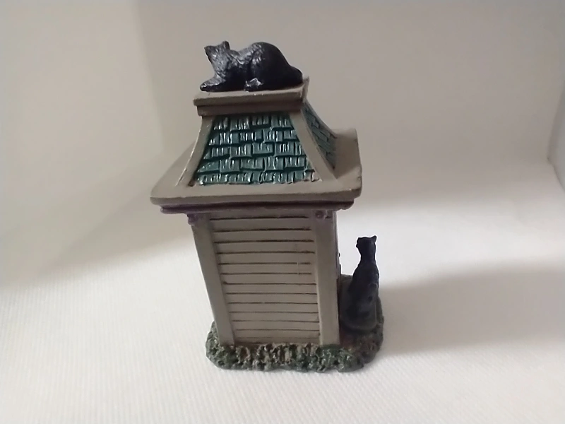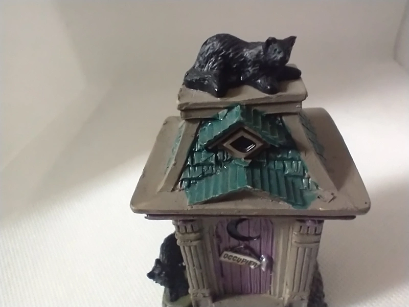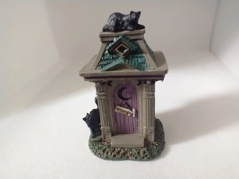 Excellent used condition of a spooky haunted outhouse complete with two black kitties anxiously waiting for their human (or ghoul) to come out...so they can ignore them. Crescent moon and "Occupied" sign on the door of this fun little decoration.