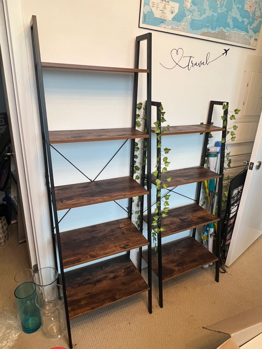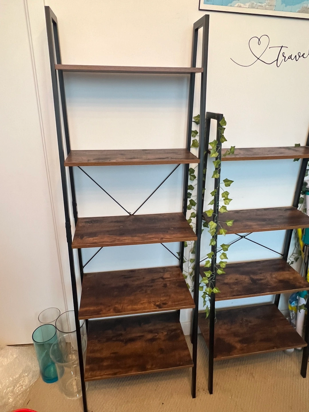 Ladder Shelves, 5-Tier & 4-tier Bookshelves. Either sold as a pair or separately. Can’t remember where I bought this from, but Amazon is currently selling the 4 tier for $80 and 5 tier for $110, not assembled. I am selling both for $120 or 4 tier for $40 and 5 tier for $80.