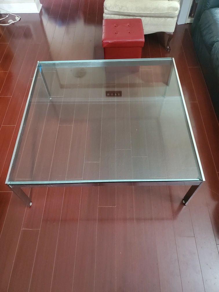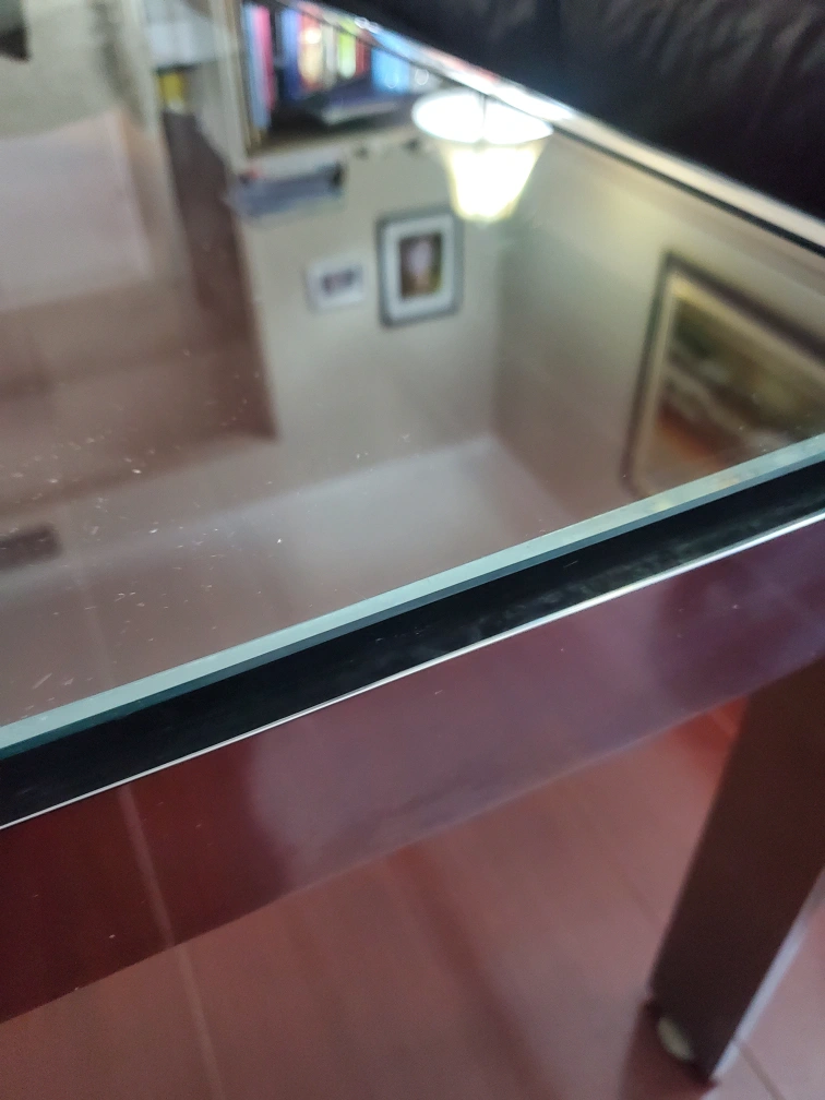 Glass top is appr. 3/4" thick. It is in good condition with a few minor defects.