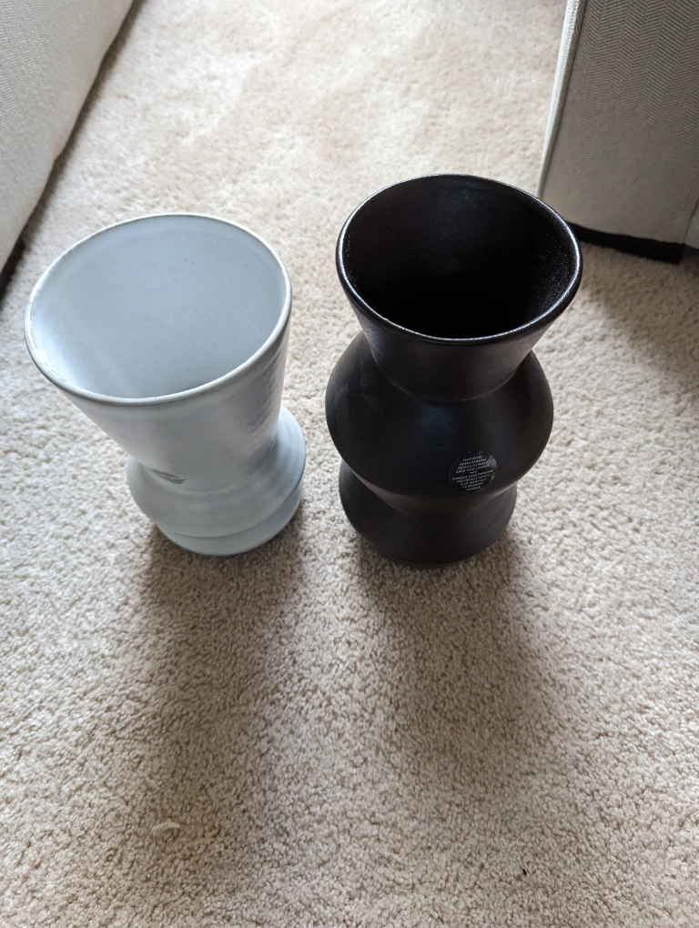 54Modern Terracotta Vase, Medium by OUI - BRAND NEW in BOX A matte white glaze is the perfect foil to the clean lines of this modern terracotta vase. Striking angles create a dimensional design featuring a tall neck that tapers to a wide opening. Use it to showcase a lush bouquet or display it solo as sculptural ceramic. 10.6” in diameter, 8.7” tall. Terracotta. Clean with a soft, damp cloth. Made in Portugal. OUI is a new brand of thoughtfully designed living solutions that make room for your best, most joyful life. OUI creates unique products that brim with purpose and positivity. Make room for your story with OUI. Exclusive to Indigo. CREAM VASE - Product name Modern Terracotta Vase, Medium Type Home Accents Shipping dimensions 8.66" H x 4.33" W x 4.33" L Color CREAM Release date Oct 16, 2020 UPC 882709561279 BLACK VASE - Product name Modern Terracotta Vase, Medium Type Home Accents Shipping dimensions 8.66" H x 4.33" W x 4.33" L Color BLACK Colour family Black Release date Oct 16, 2020 UPC 882709561286 https://www.indigo.ca/en-ca/modern-terracotta-vase-medium/882709561286.html $15 each or both for $20 negotiable